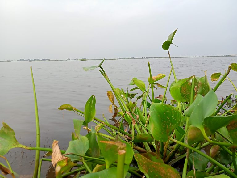 Alternative Text: A tranquil view of a calm body of water with lush green water hyacinths in the foreground. The plants feature broad leaves, some with brown edges, and rise from the water’s surface.