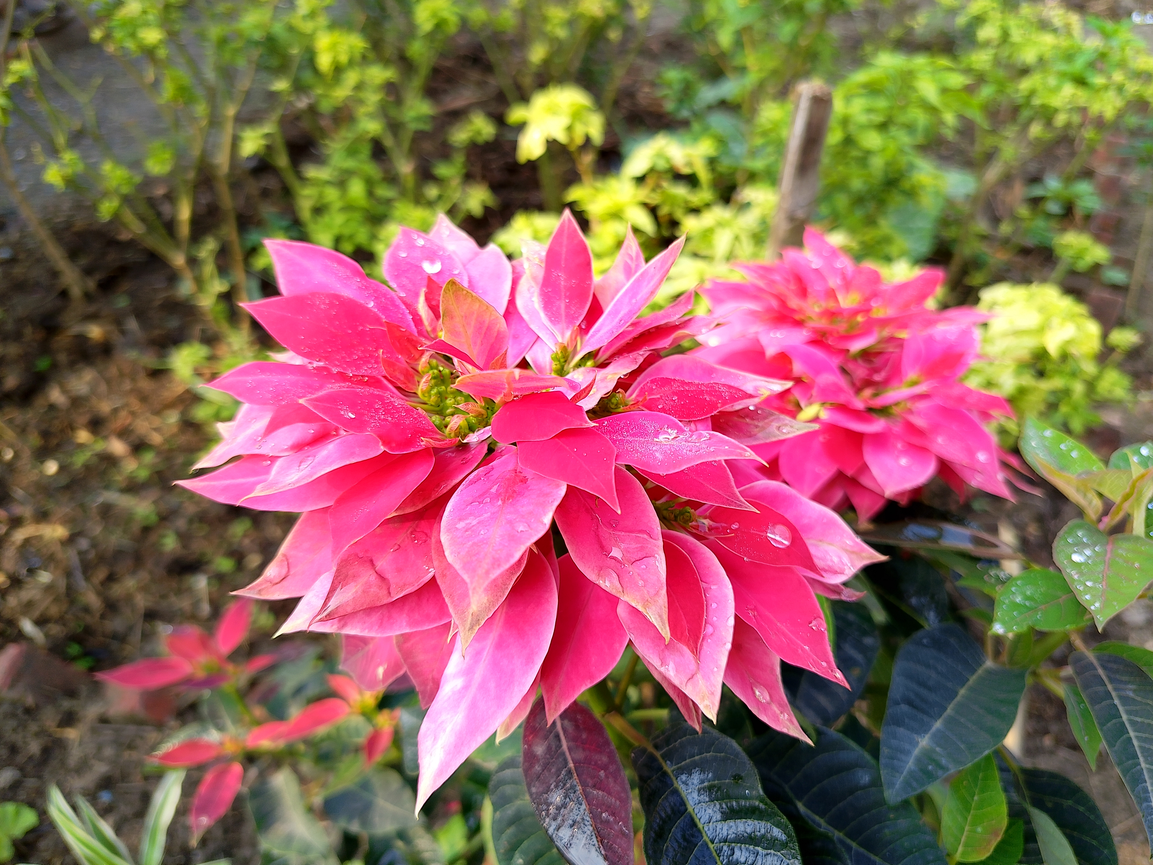 Alternative Text: A close-up of bright pink poinsettia-like flowers with pointed petals, covered in small water droplets, surrounded by green leaves in a garden setting.
