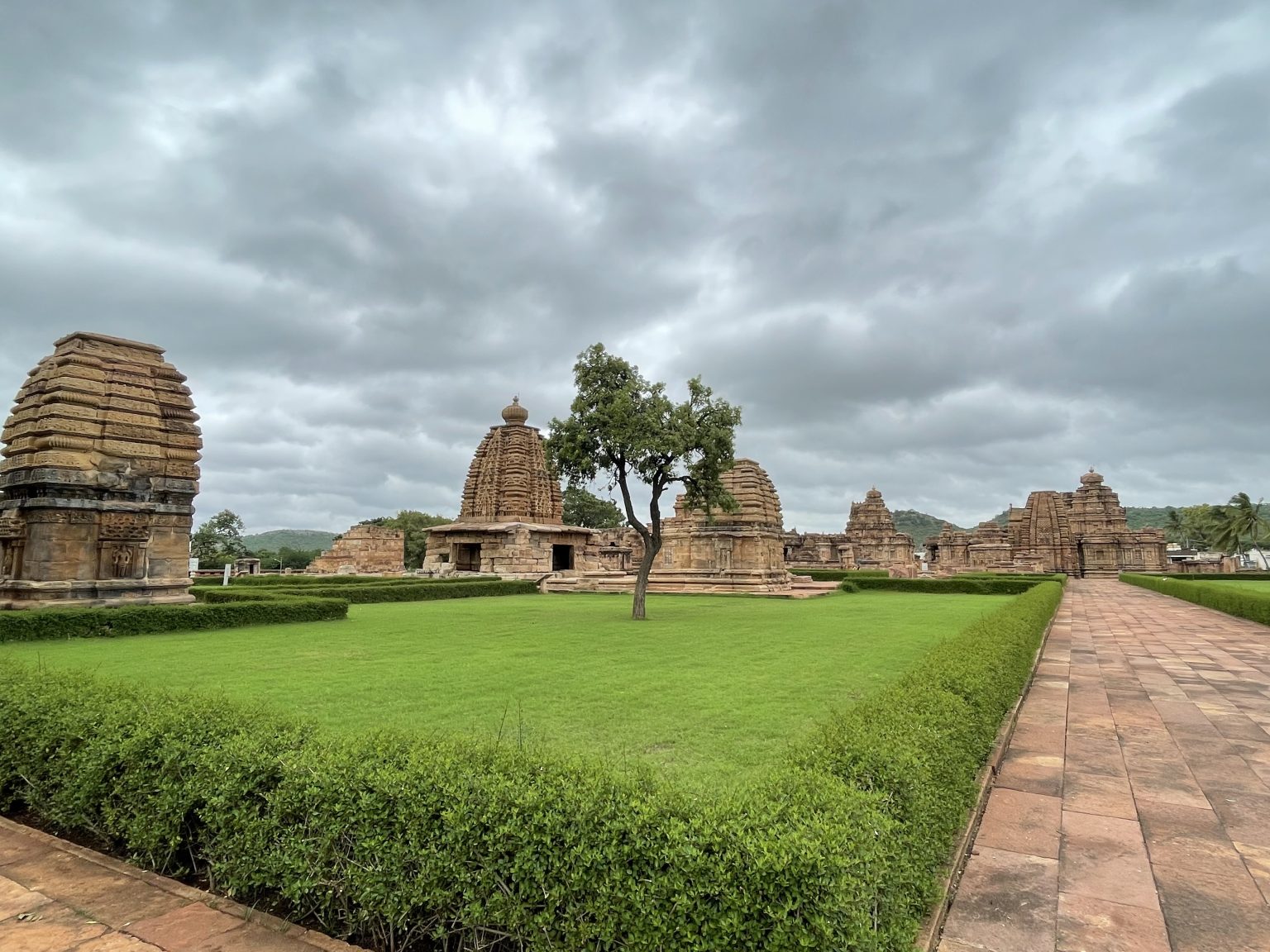 Alternative Text: A serene landscape featuring ancient temples with intricate architecture set in a lush green garden with manicured hedges and a stone pathway leading to the structures.