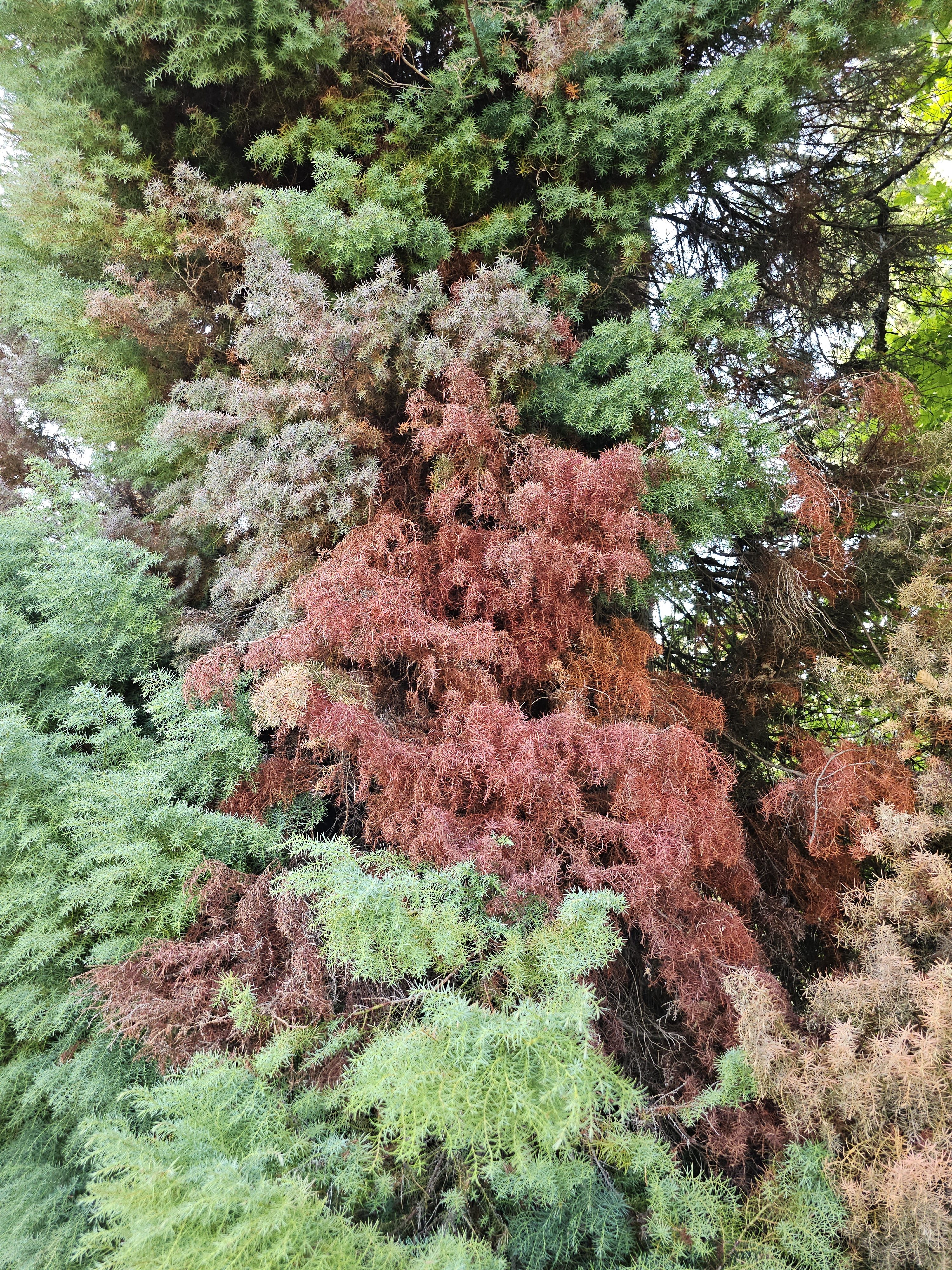 Alternative Text: Colorful tree foliage with green, brown, and red branches. Captured in the evening at Pittock Mansion, Portland.