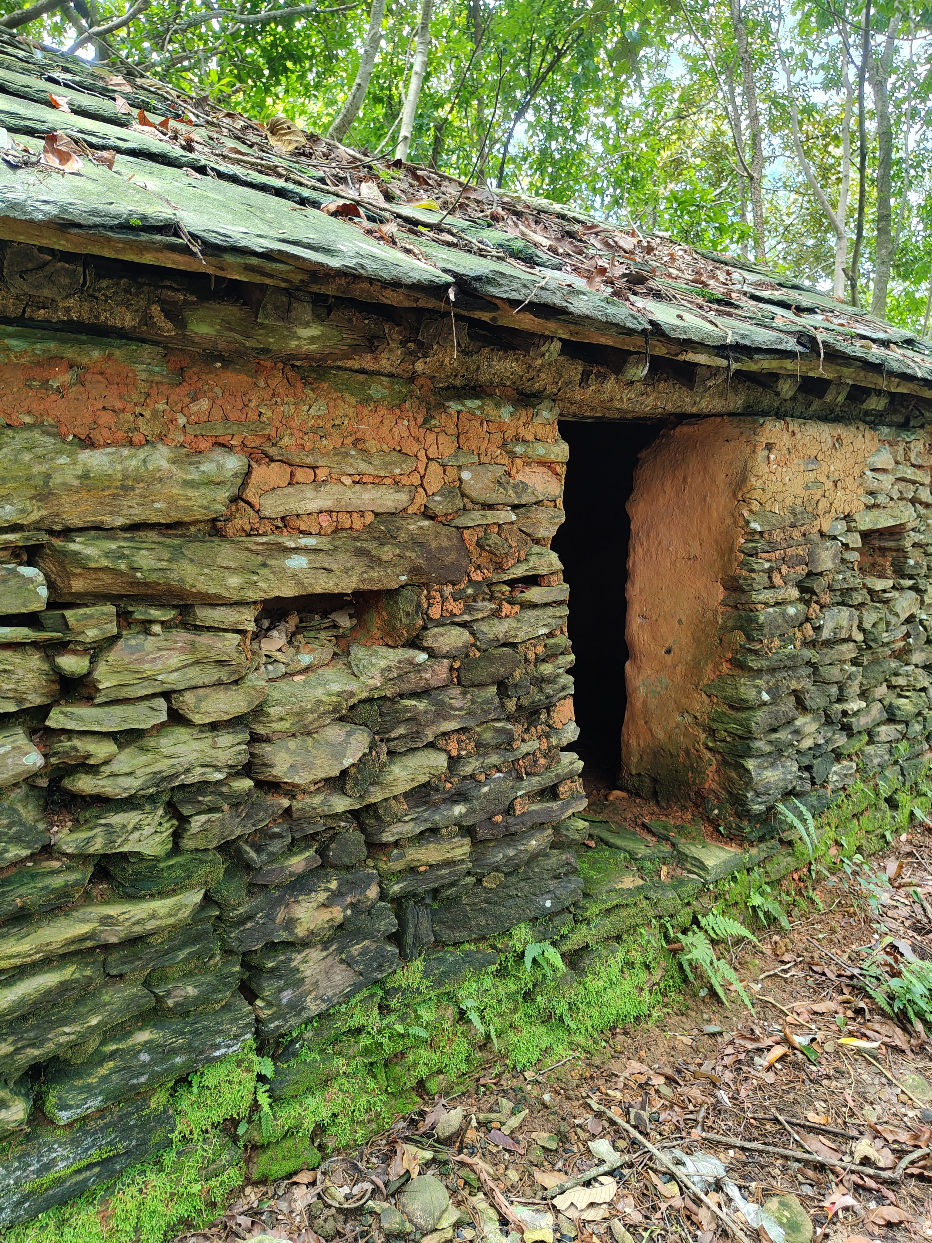 Alternative Text: A small, weathered stone structure partially covered in moss and surrounded by greenery.