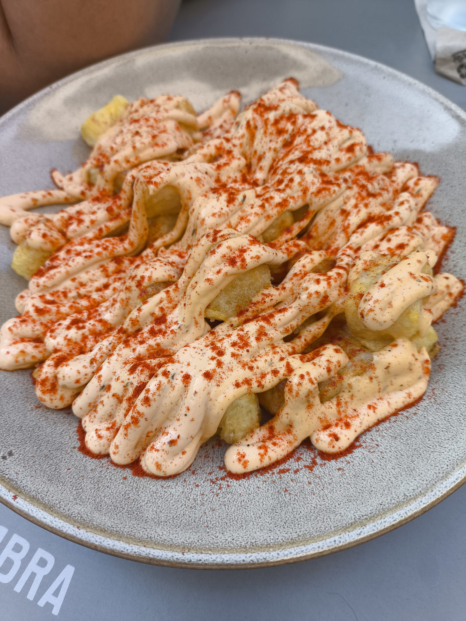 Alternative Text: A close-up view of a plate of Patatas Bravas crispy potato chips or fries topped with a creamy sauce and a generous dusting of paprika.