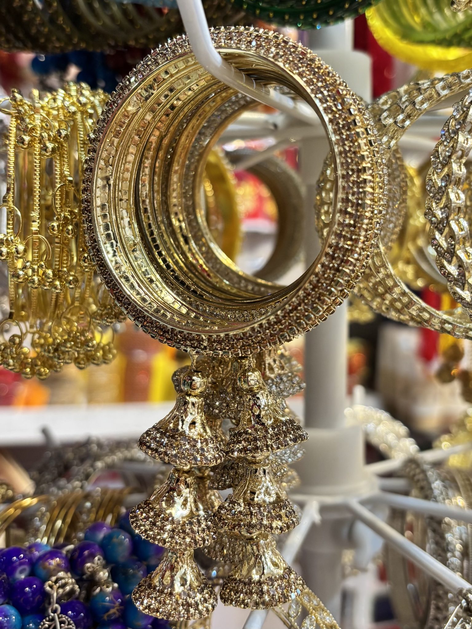 Alternative Text: A collection of intricate gold bangles displayed prominently on a stand