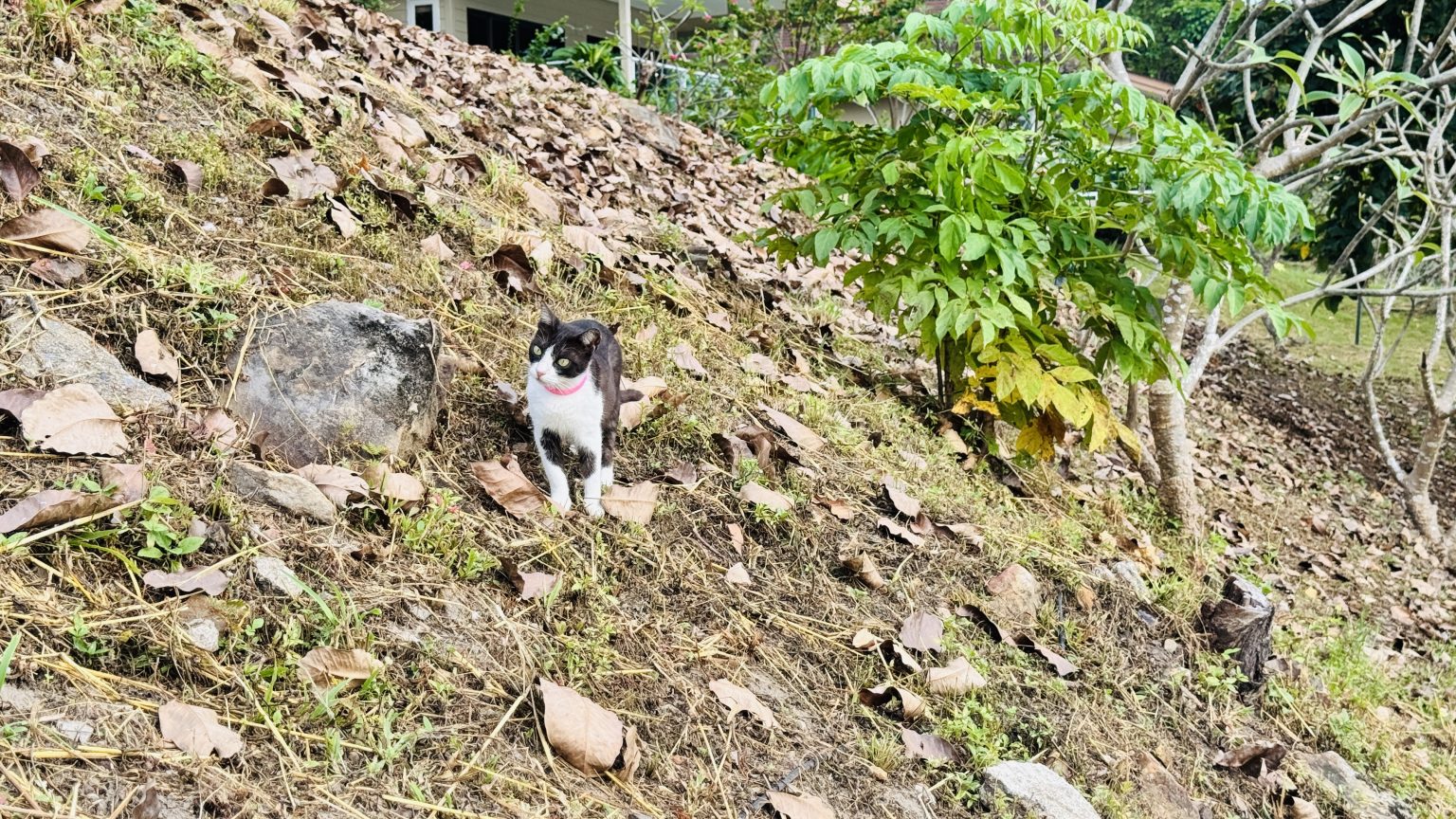Alternative Text: A black-and-white cat with a pink collar stands on a steep, leaf-covered slope beside a large rock.