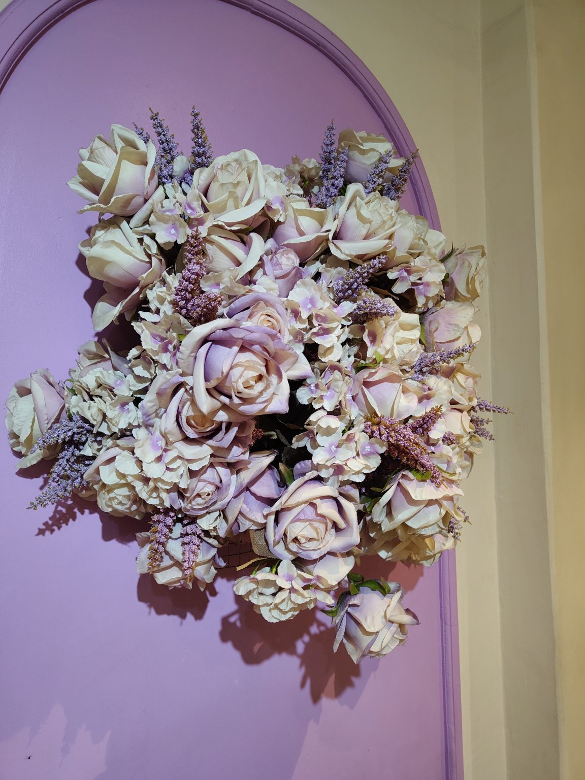 Alternative Text: A decorative arrangement of artificial flowers, featuring a variety of roses in soft shades of cream and lavender, accompanied by small purple florals and greenery.
