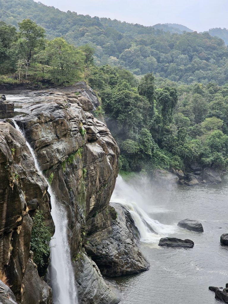 Alternative Text: Side view of Athirappilly Falls. Where water and nature harmonize. A famous tourist spot in Kerala.
