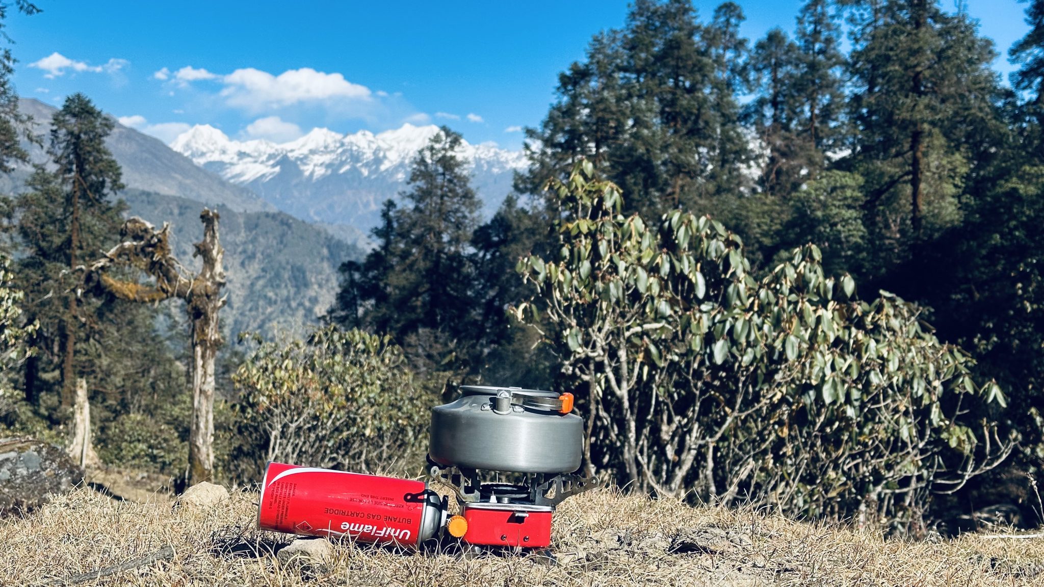 Alternative Text: A camping stove and a gas canister are positioned on the ground, surrounded by dry grass. In the background, towering mountains capped with snow rise against a clear blue sky, partially covered with wispy clouds.