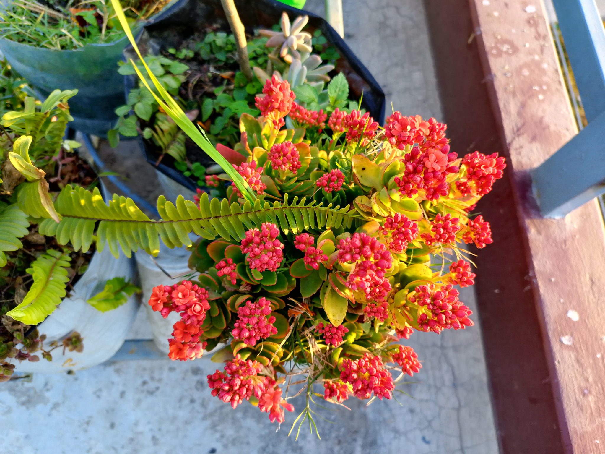 Alternative Text: A close-up view of a vibrant potted plant displaying clusters of red flower buds atop green, fleshy leaves.