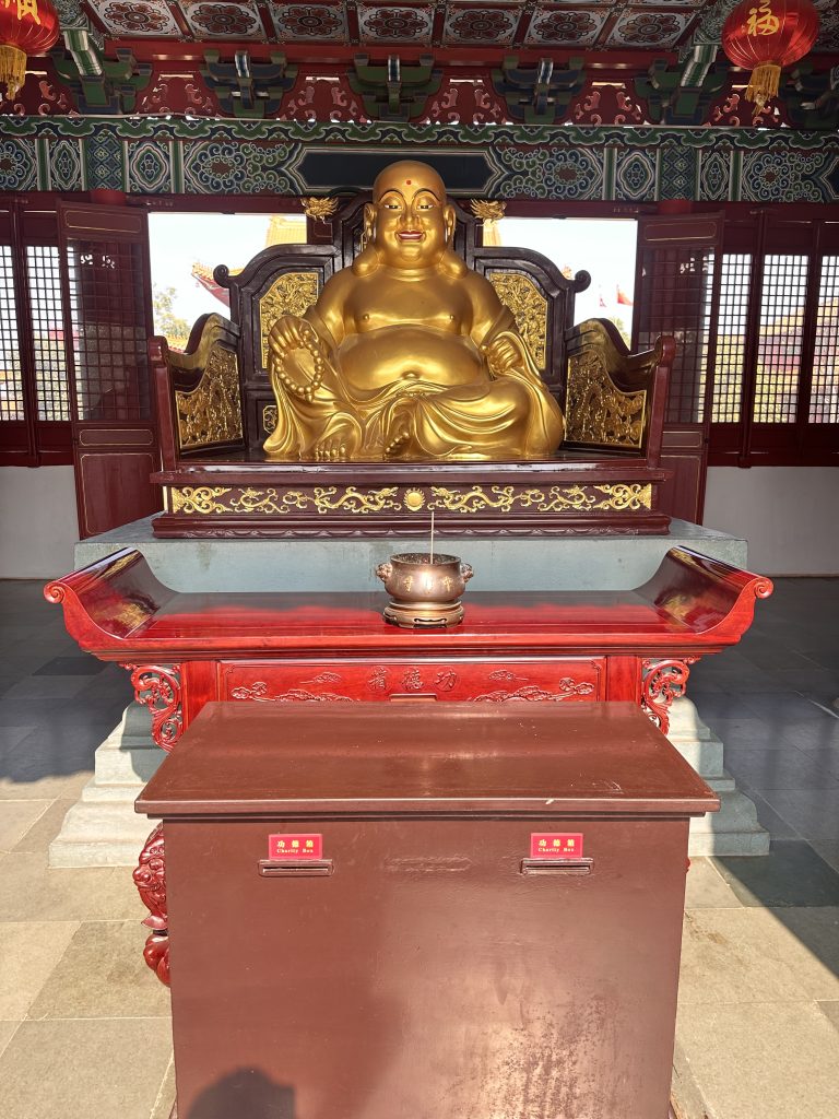 Alternative Text: A large golden Laughing Buddha statue sits on an ornately carved wooden platform, smiling cheerfully.