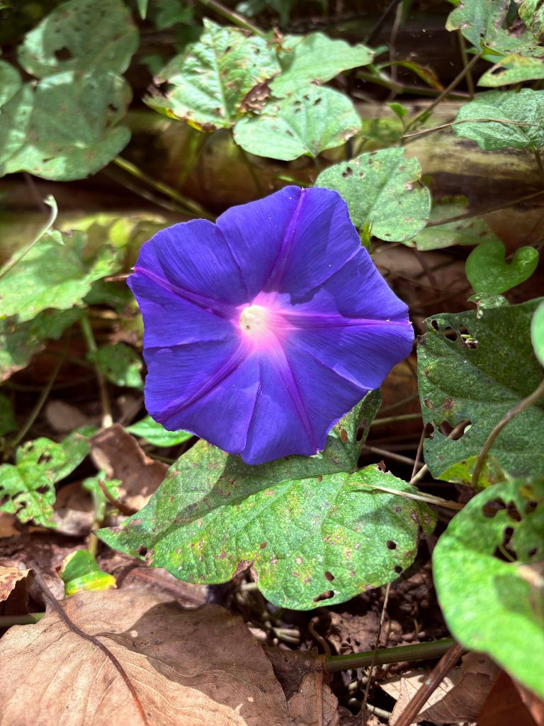 Alternative Text: A vibrant purple flower with a star-like pattern in the center sits among lush green leaves and fallen brown foliage.