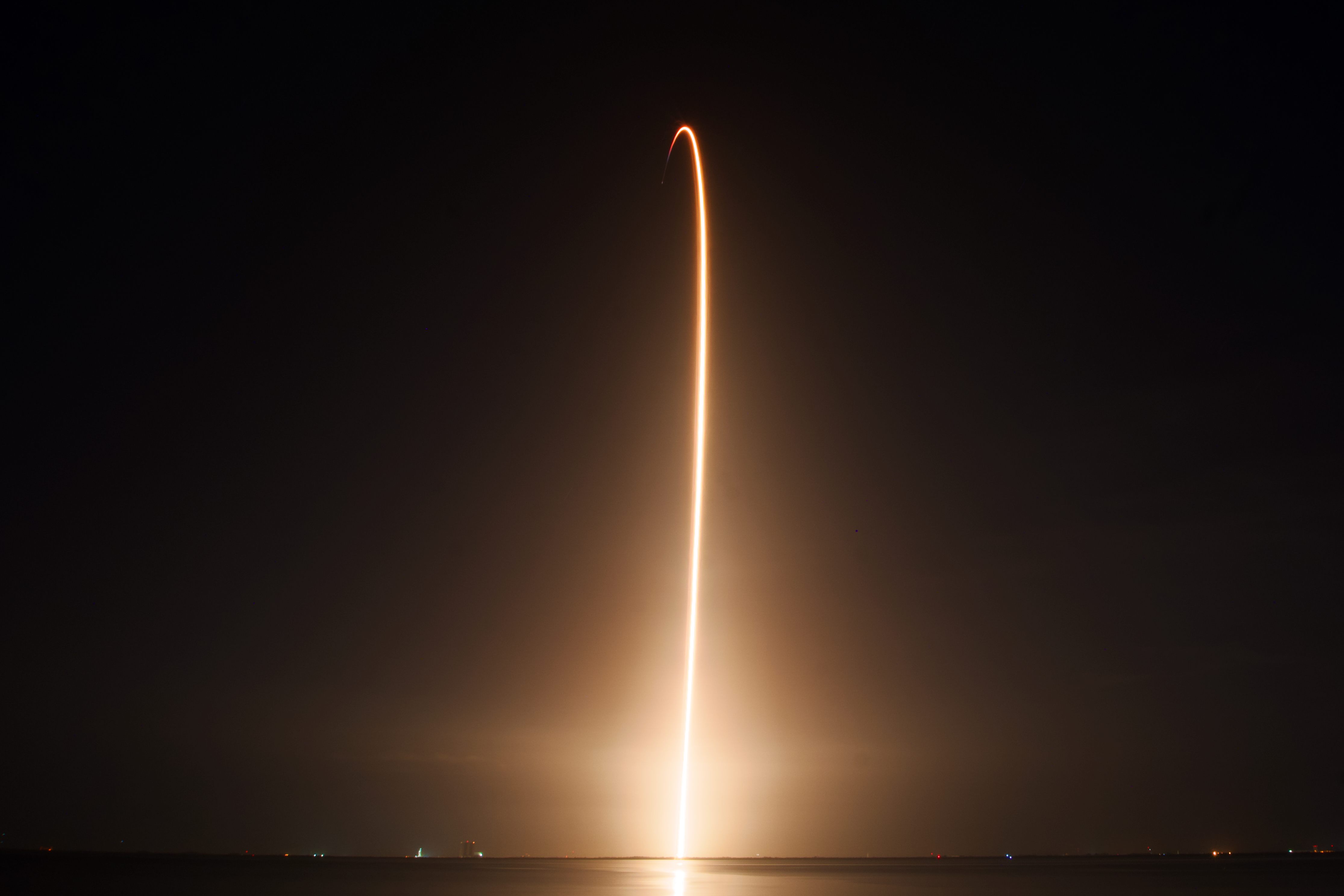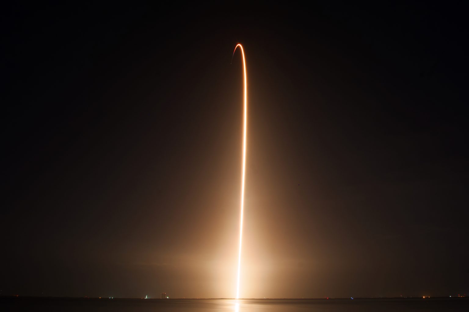 Alternative Text: An orange light trail streaks into the dark night sky as a Falcon 9 rocket launches a commercial satellite.
