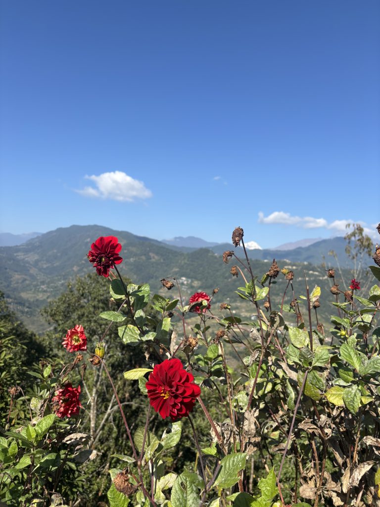 Alternative Text: A vibrant red flower blooms amidst green foliage, set against a backdrop of distant mountains and a clear blue sky dotted with a few white clouds.