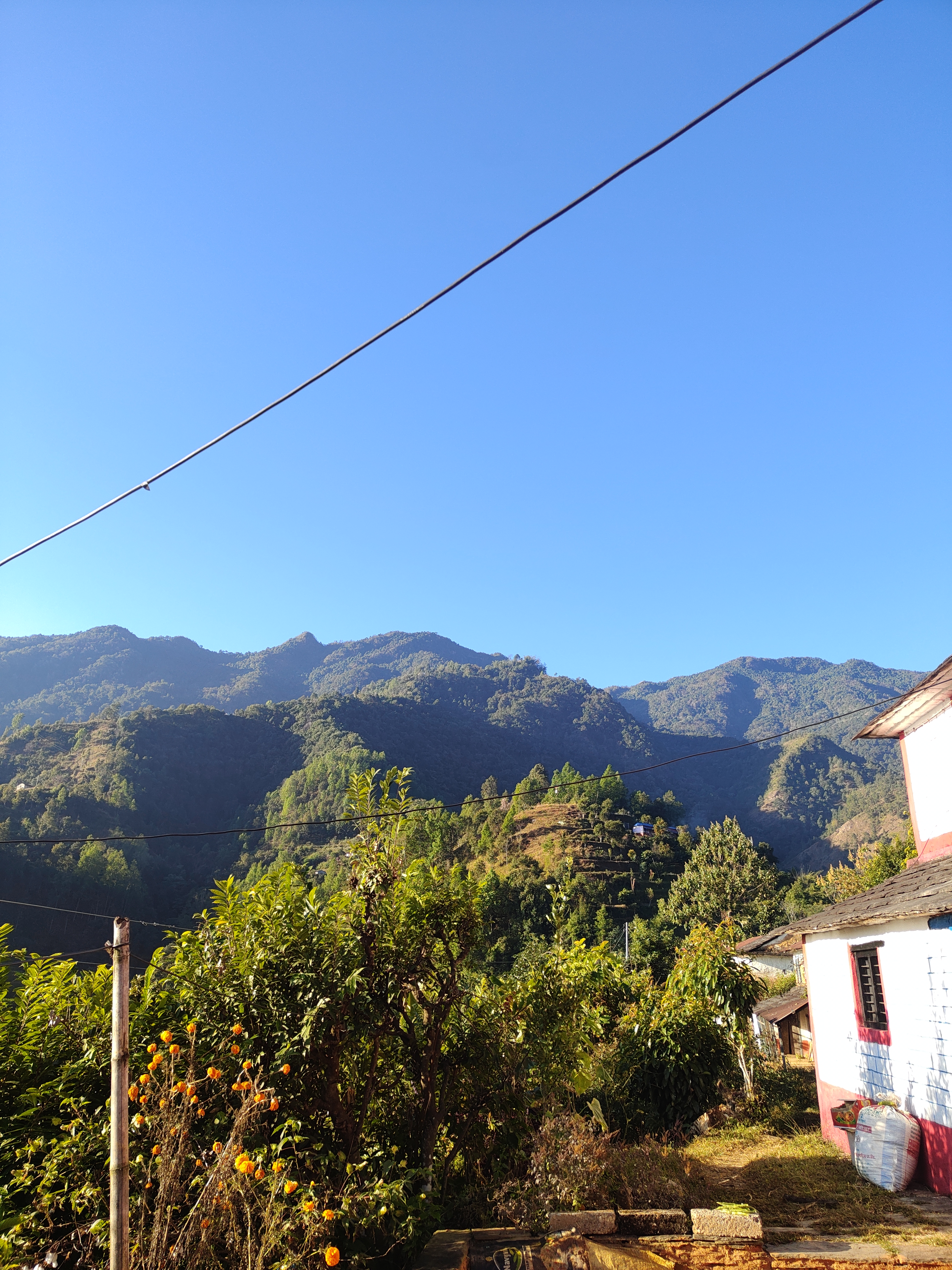 Alternative Text: A scenic view of mountains under a clear blue sky, with lush greenery and a variety of plants in the foreground, including bright orange flowers.
