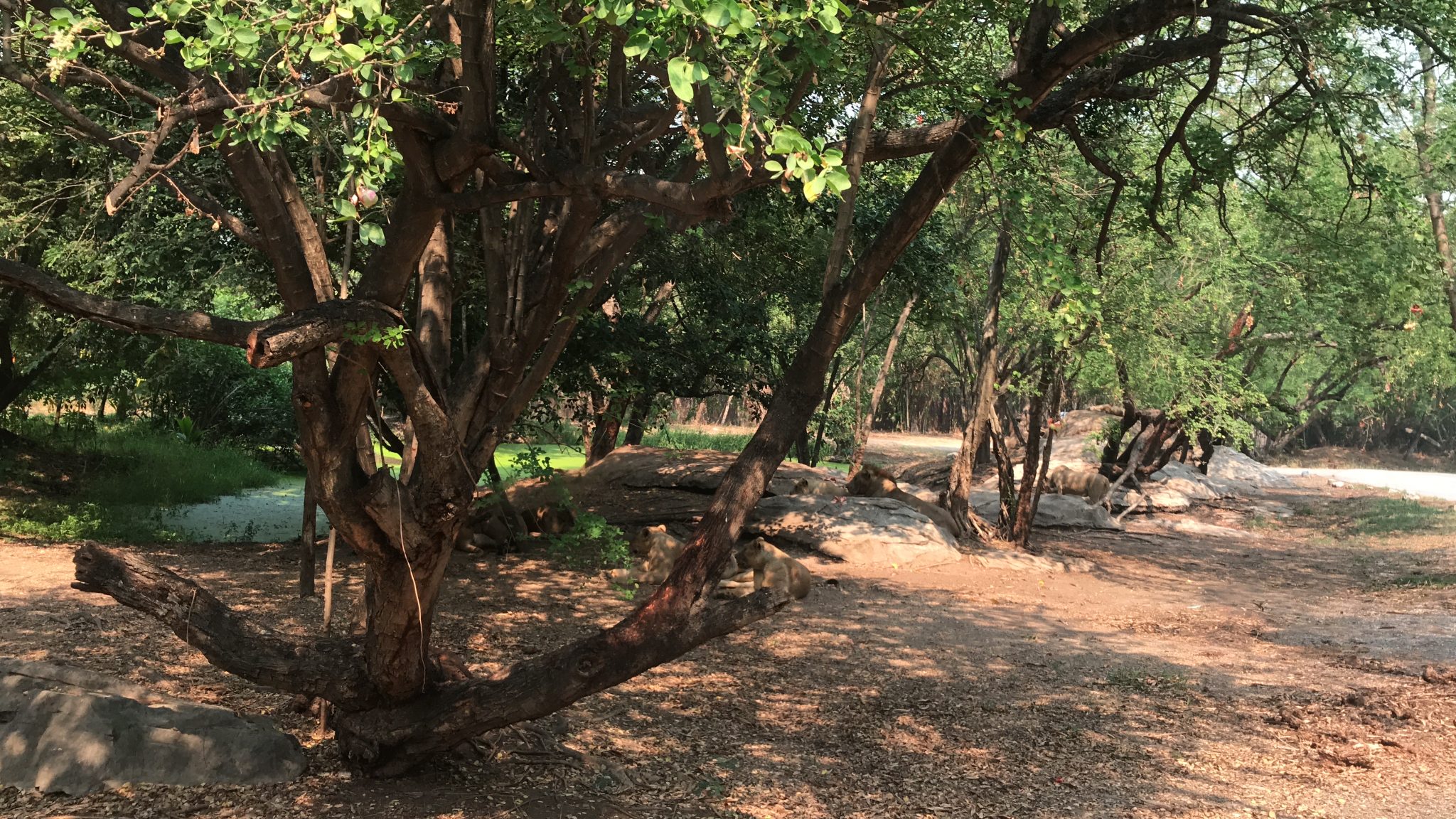 Alternative Text: A path in a wooded area with trees and large rocks, with a stream visible in the distance.