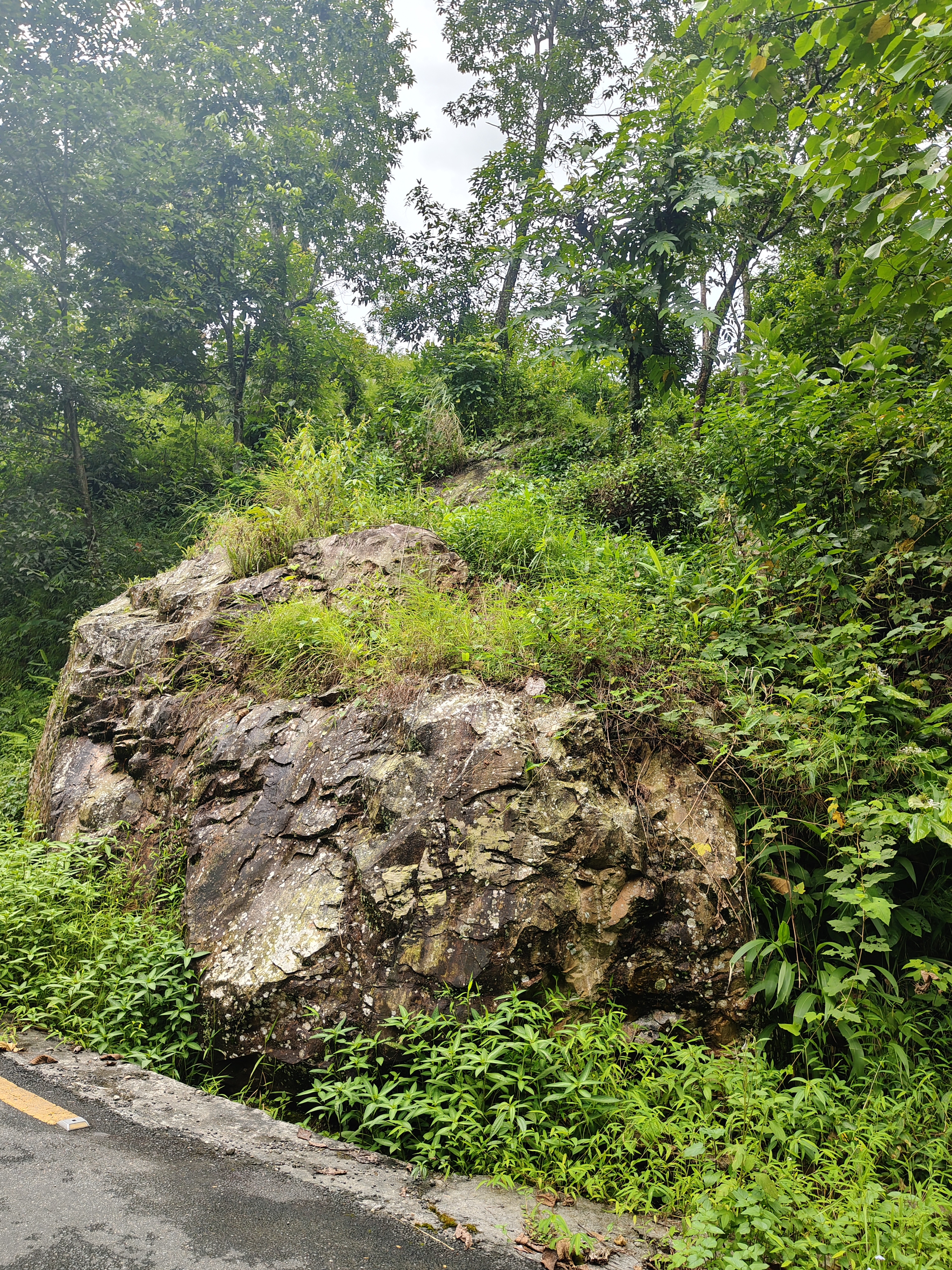 Alternative Text: A large rock covered in various green plants and grass stands beside a narrow road.