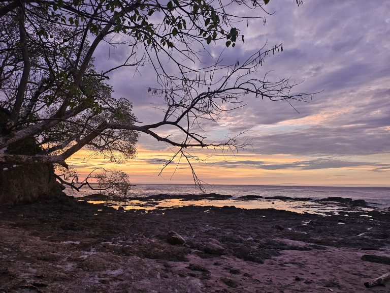 Alternative Text: A tranquil beach scene at sunset, featuring the silhouette of a tree with sparse branches and some leaves.