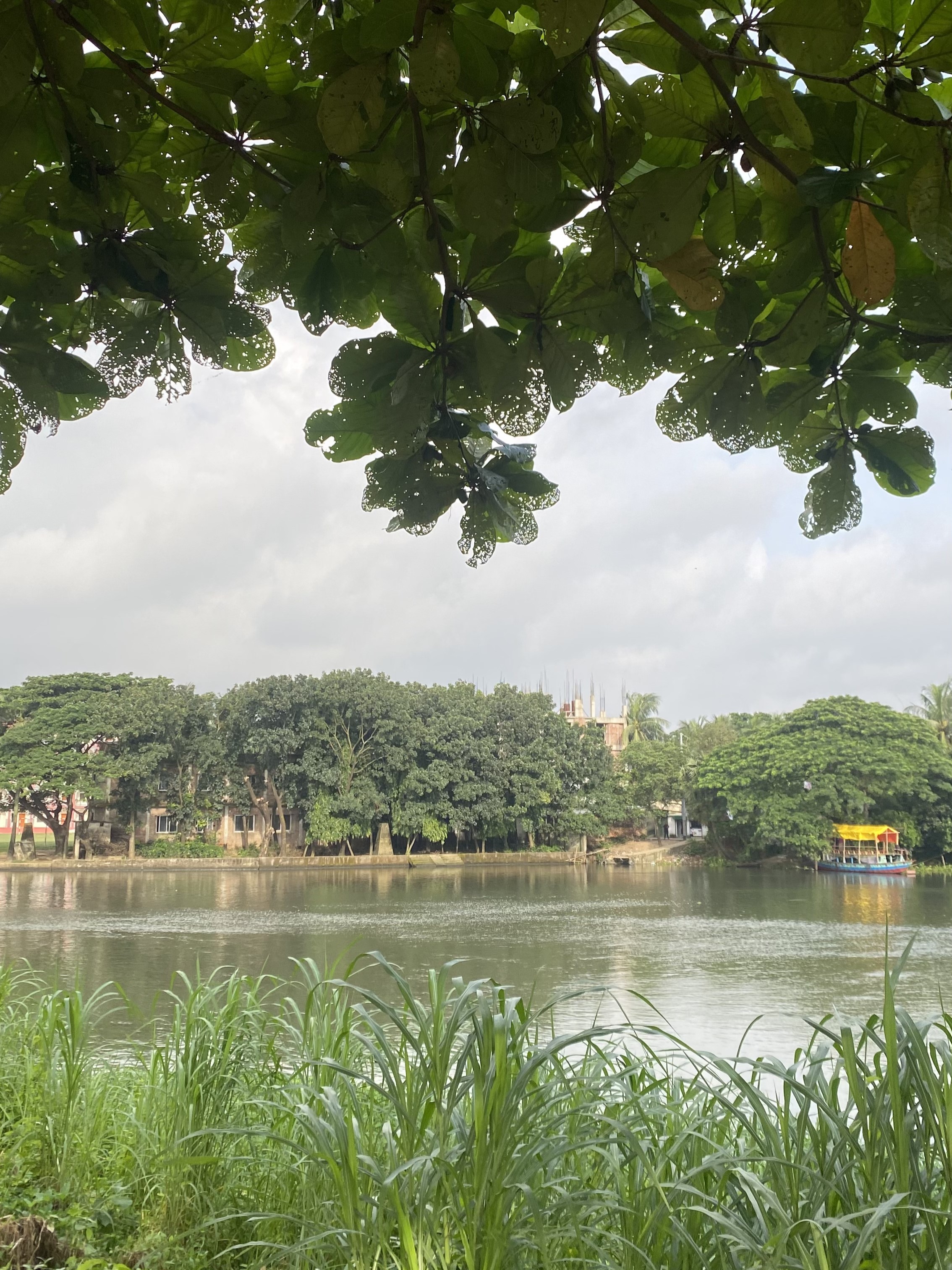 Alternative Text: This is a serene lake view with a building visible in the background under a clear blue sky.
