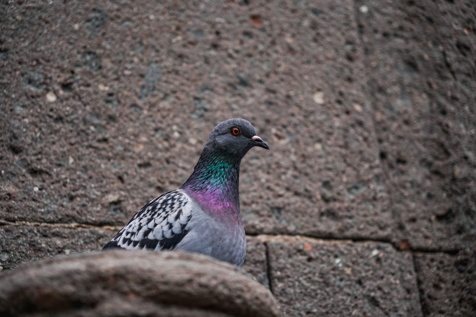 Alternative Text: A close-up of a creepy pigeon perched on a ledge, with its head turned slightly to the side. The bird has gray feathers with a glossy green and purple sheen on its neck