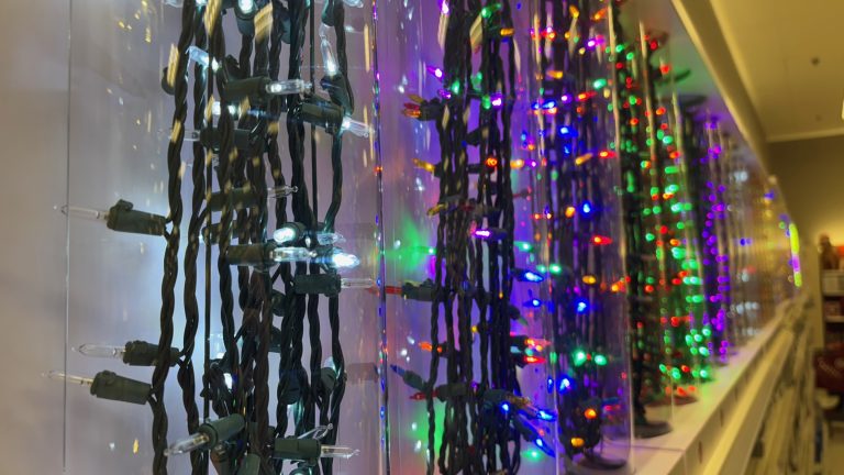 Alternative Text: Christmas lights on display, on the left they’re closeup and blurring into the distance.