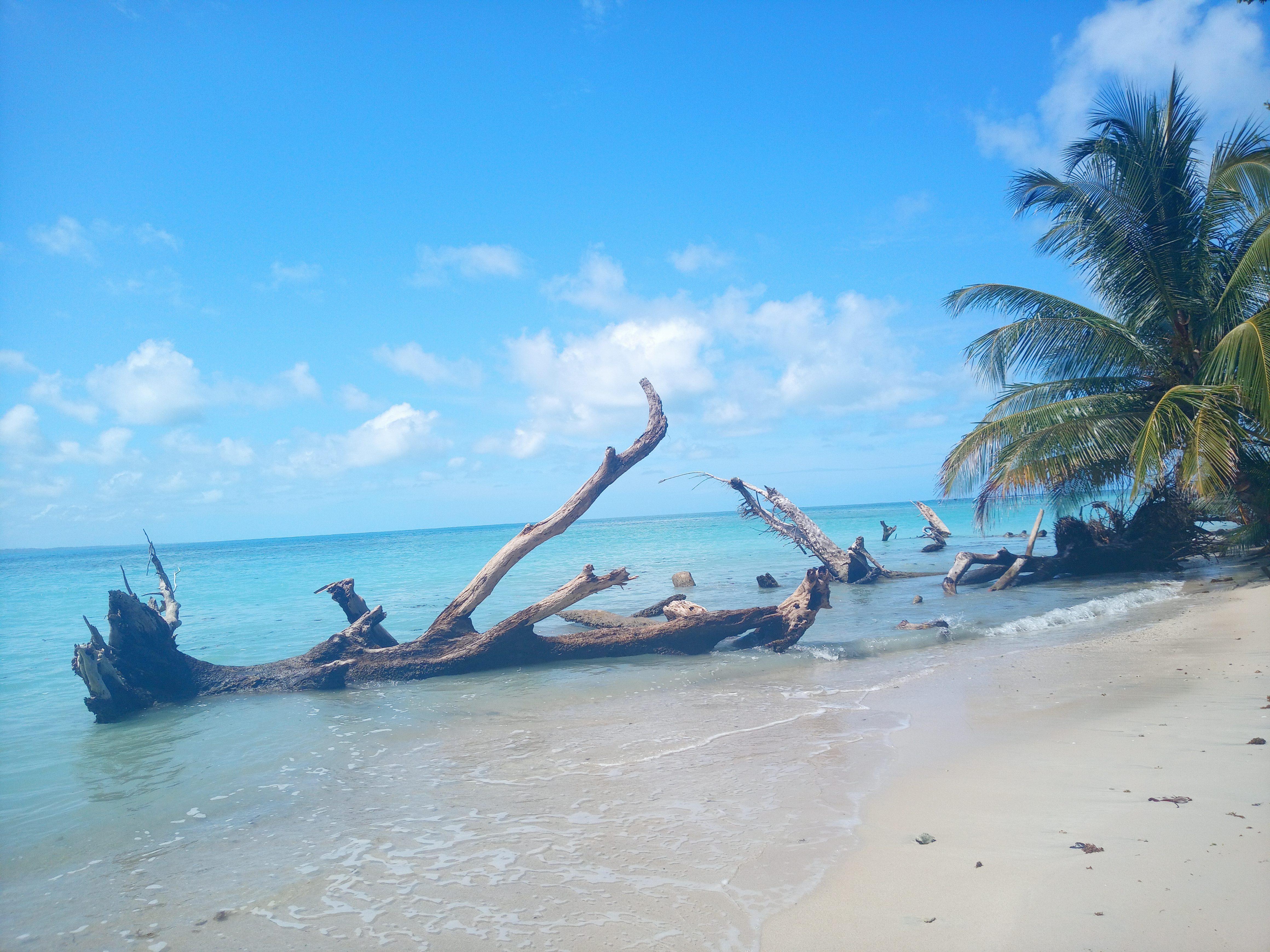 Alternative Text: A serene beach scene featuring clear turquoise waters, soft sandy shores, and a few scattered, weathered tree branches and stumps along the shoreline.