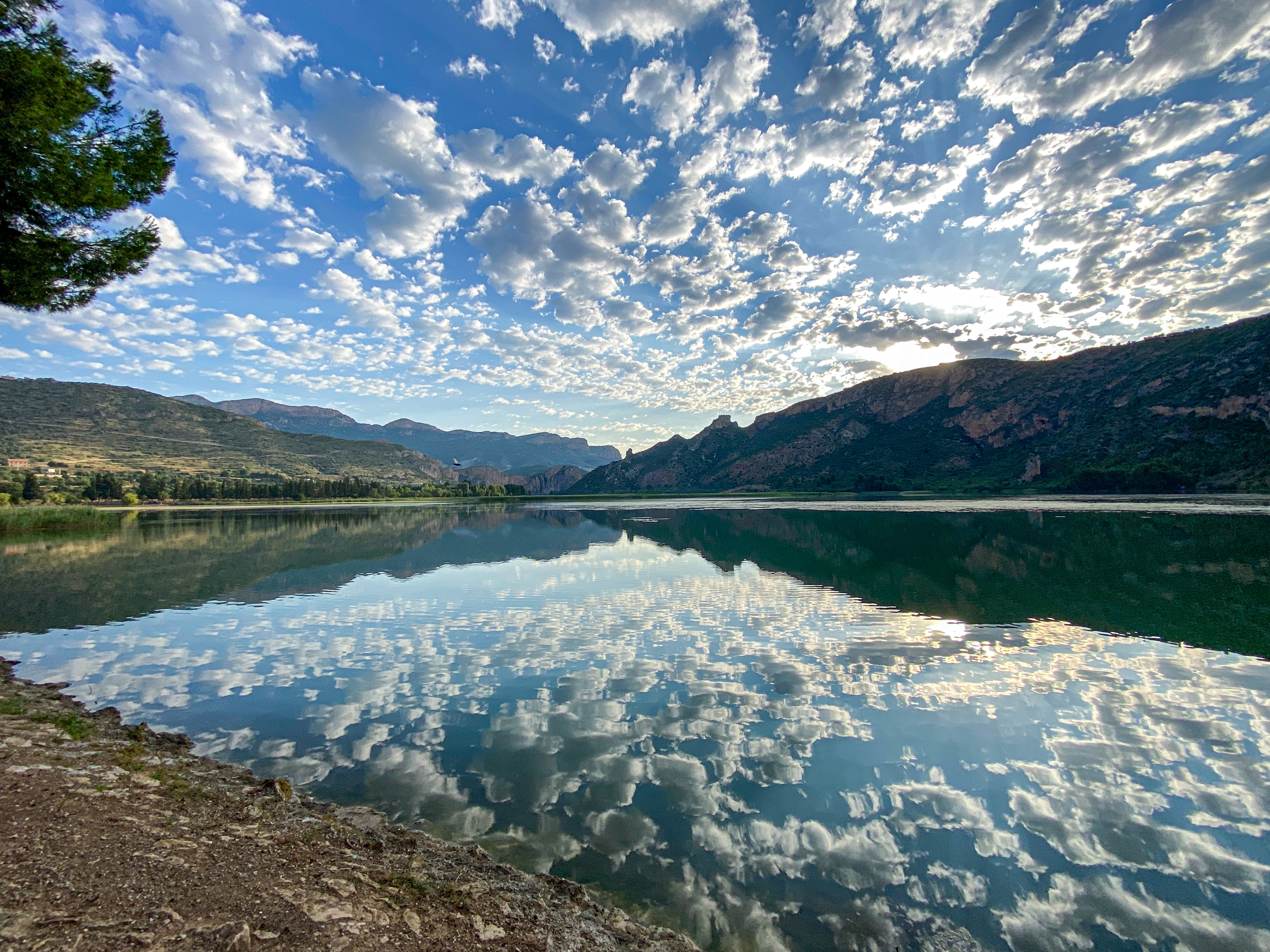 Alternative Text: A tranquil lakeside scene with a reflection of fluffy clouds in the calm water. In the background, rolling hills with sparse vegetation rise under a sky filled with scattered clouds. A few trees are visible on the left, framing the serene landscape.