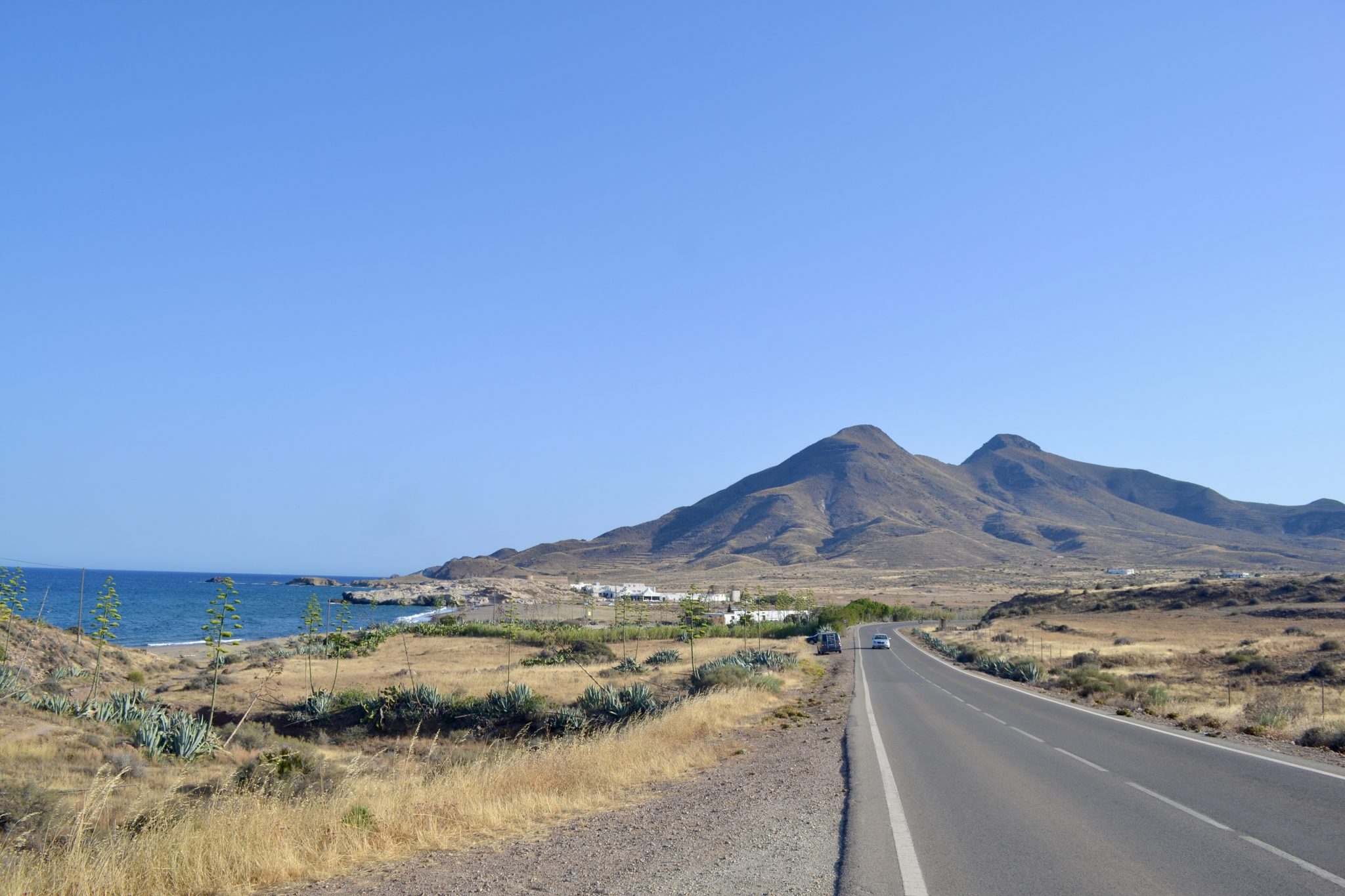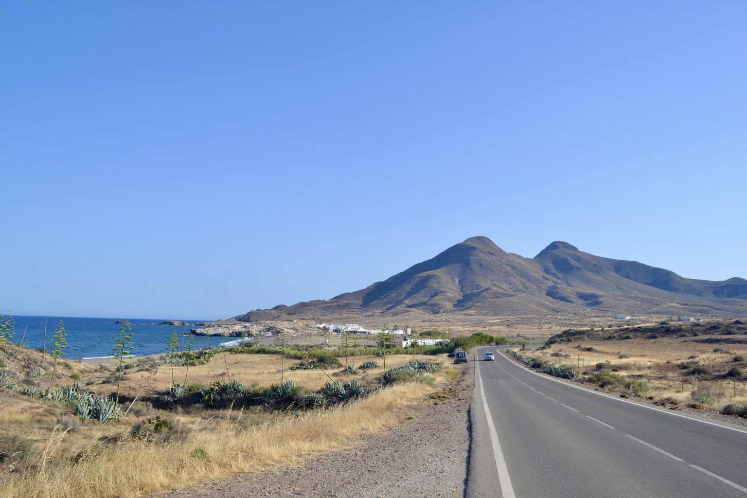 Alternative Text: A coastal road winds toward mountains under a clear sky, with sea on one side and dry plants on the other. Photo from Almería, Spain.