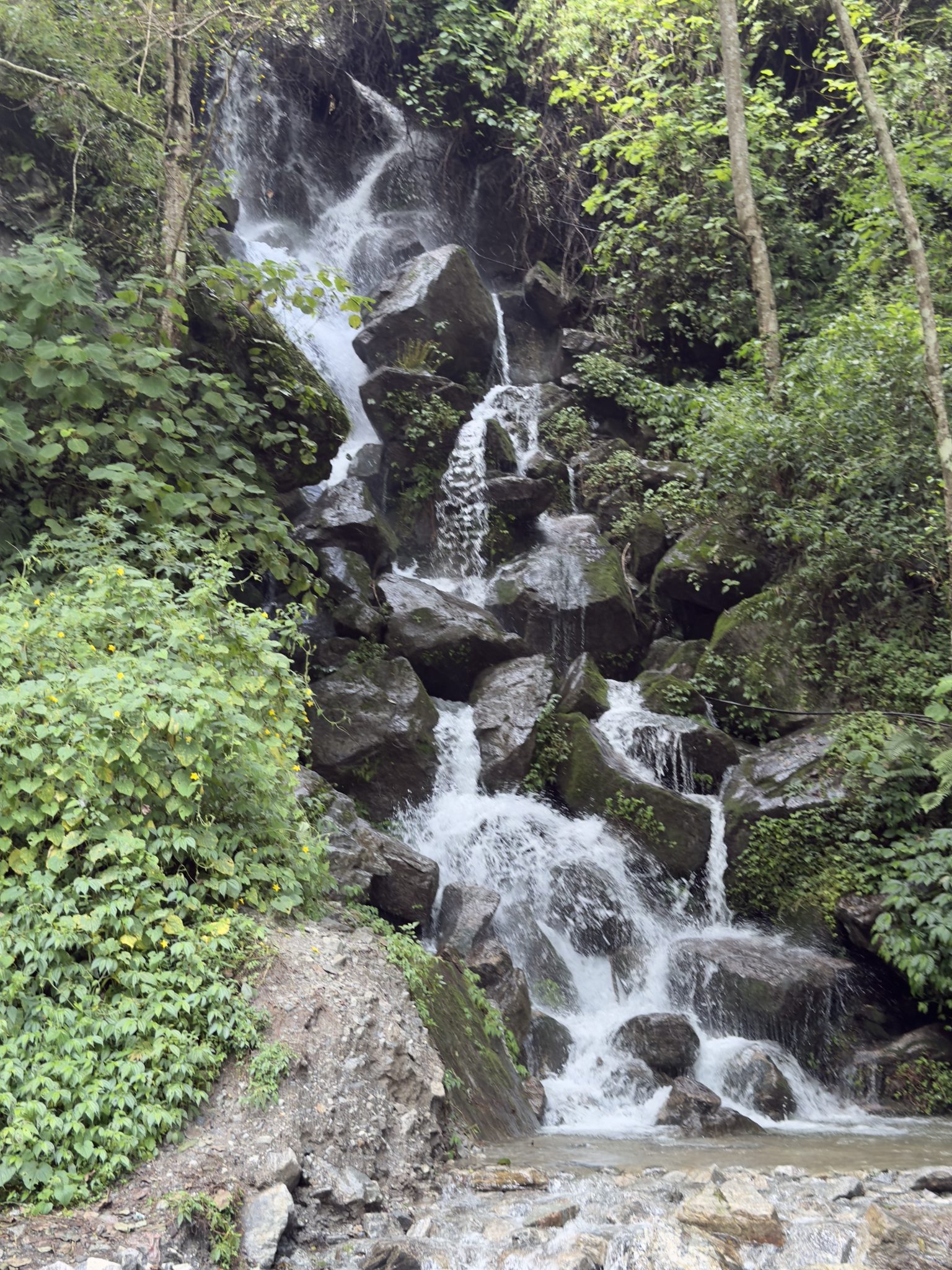 Alternative Text: A picturesque waterfall cascading down a rocky cliff, surrounded by lush greenery.