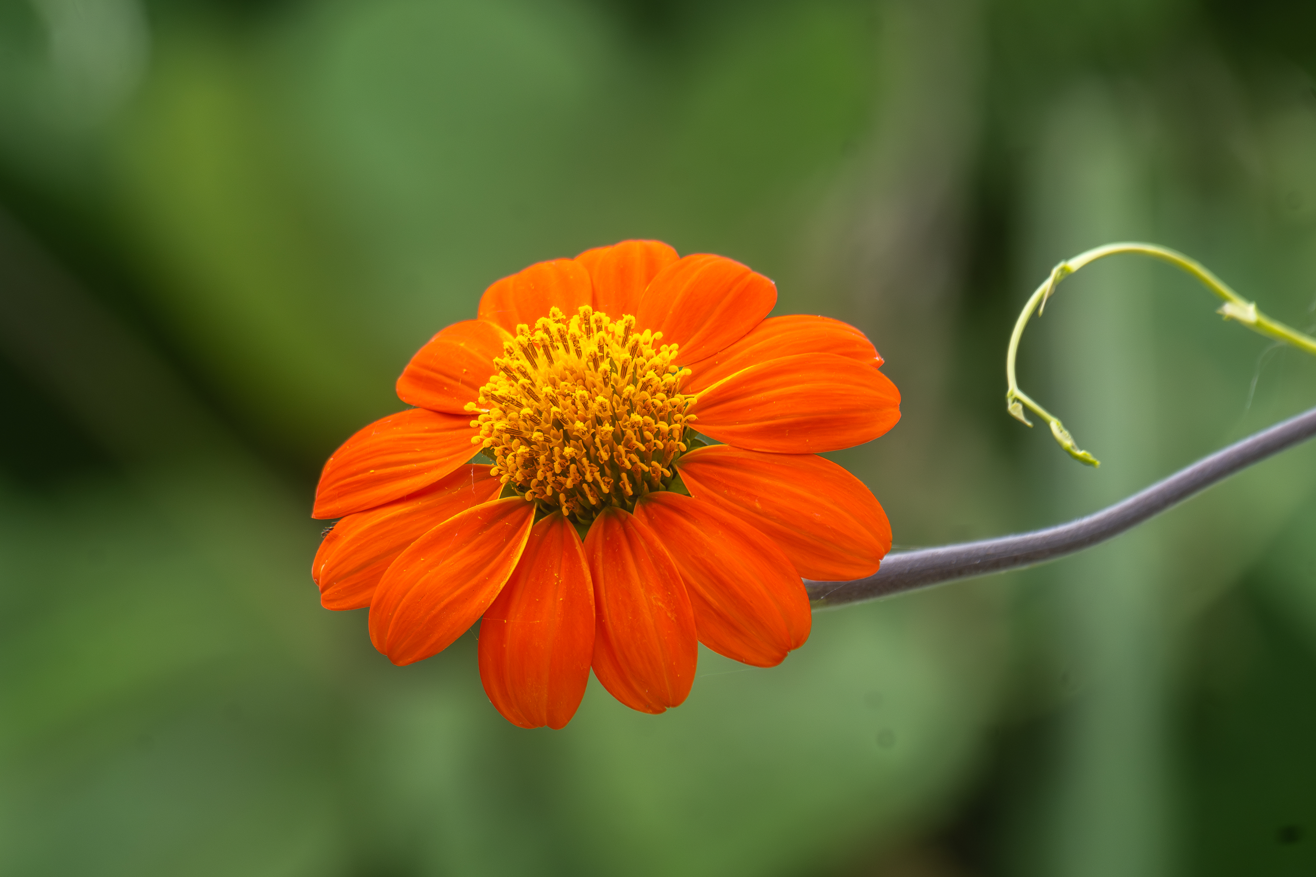 Alternative Text: A close-up of a vibrant orange flower with broad petals and a cluster of yellow stamens in the center.