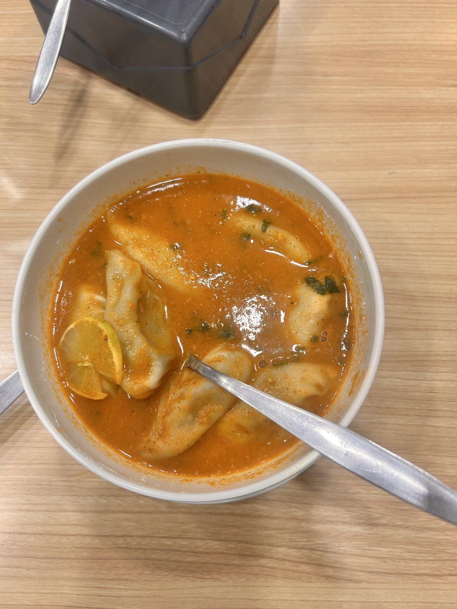 Alternative Text: A bowl of bright orange soup with dumplings and sliced lemon, garnished with herbs, and served with spoons on a wooden table.