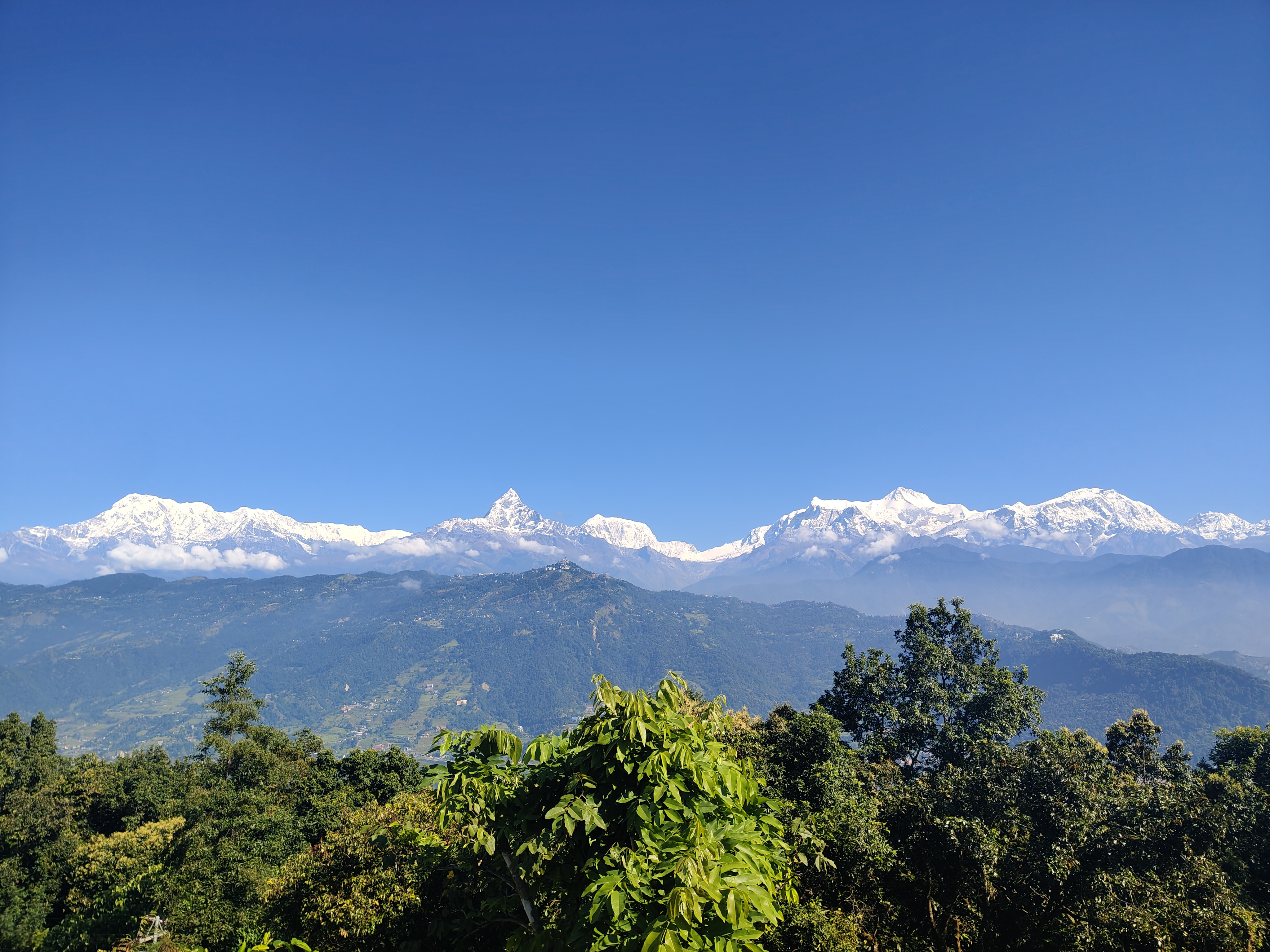 Alternative Text: A panoramic view of majestic snow-capped mountains under a clear blue sky, with lush green trees in the foreground and rolling hills visible in the landscape below