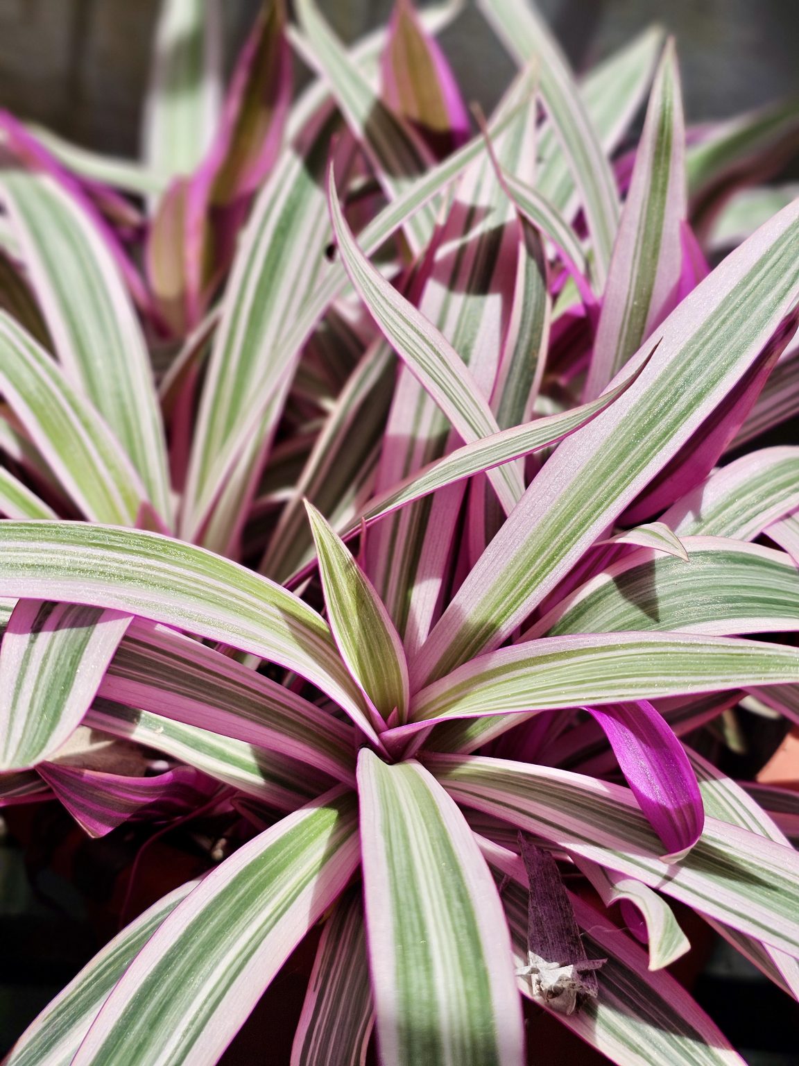 Alternative Text: Close-up of pink and green striped leaves of a Tradescantia plant, taken in natural sunlight in Perumanna, Kozhikode.