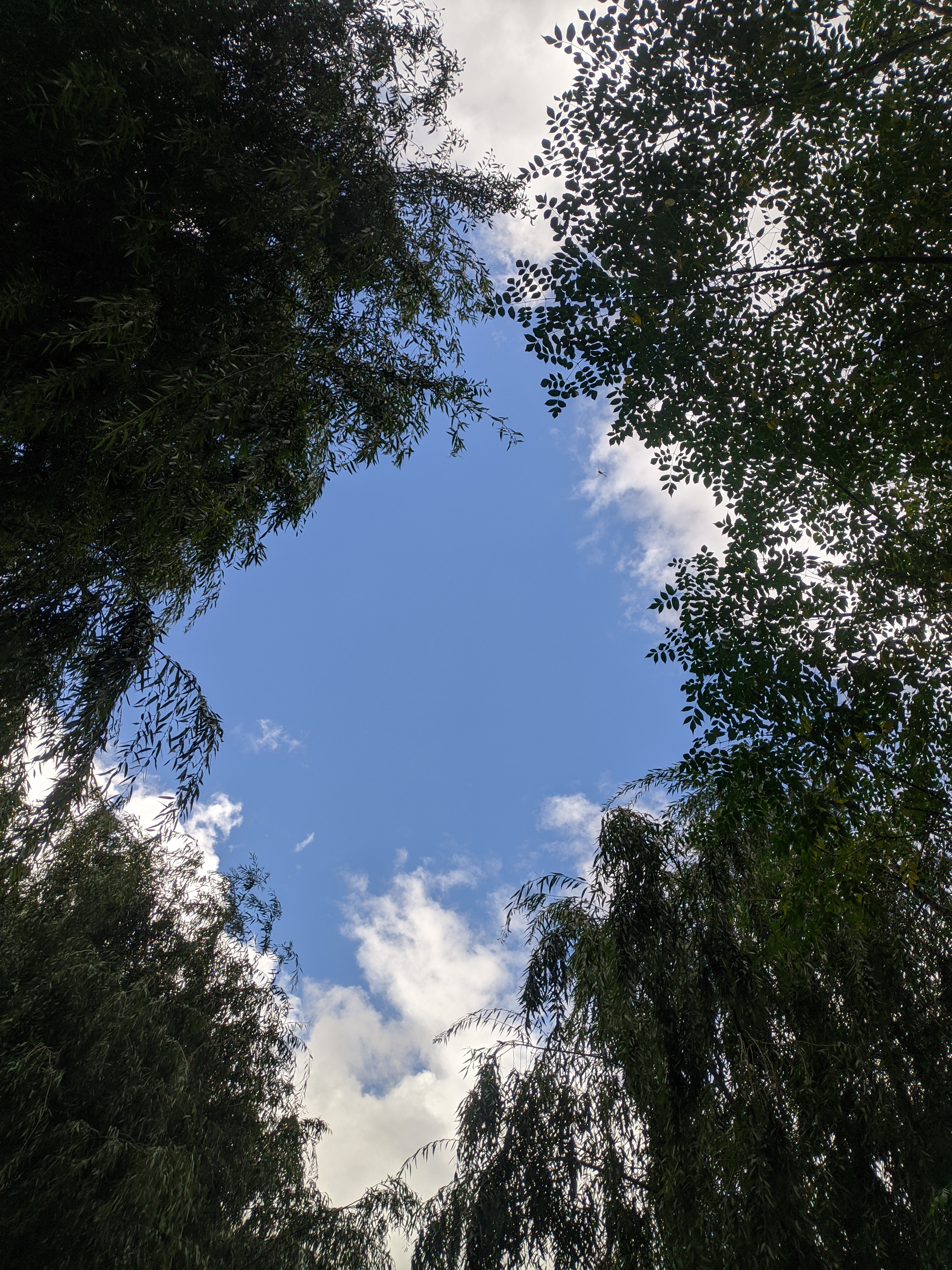 Alternative Text: A view of the sky framed by the tops of trees, with a bright blue background and scattered white clouds.