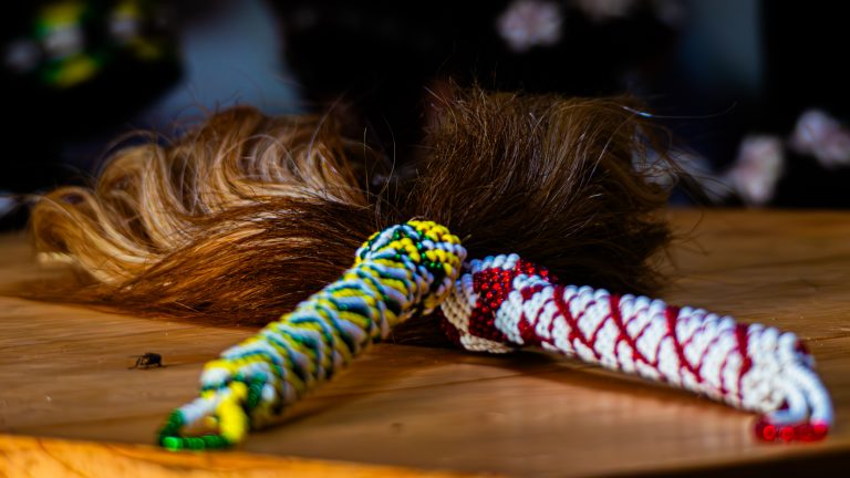 Alternative Text: A close-up of a traditional fly-whisk with long brown hair and two handles wrapped in colorful beadwork—one green, yellow, and black, and the other red and white.