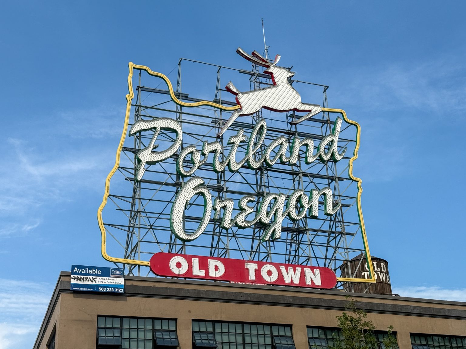 Alternative Text: The iconic “Portland Oregon – Old Town” lighted sign (seen in daylight). Atop is a leaping buck. The sign is outlined in yellow in the shape of Oregon. It sits atop a brick building.