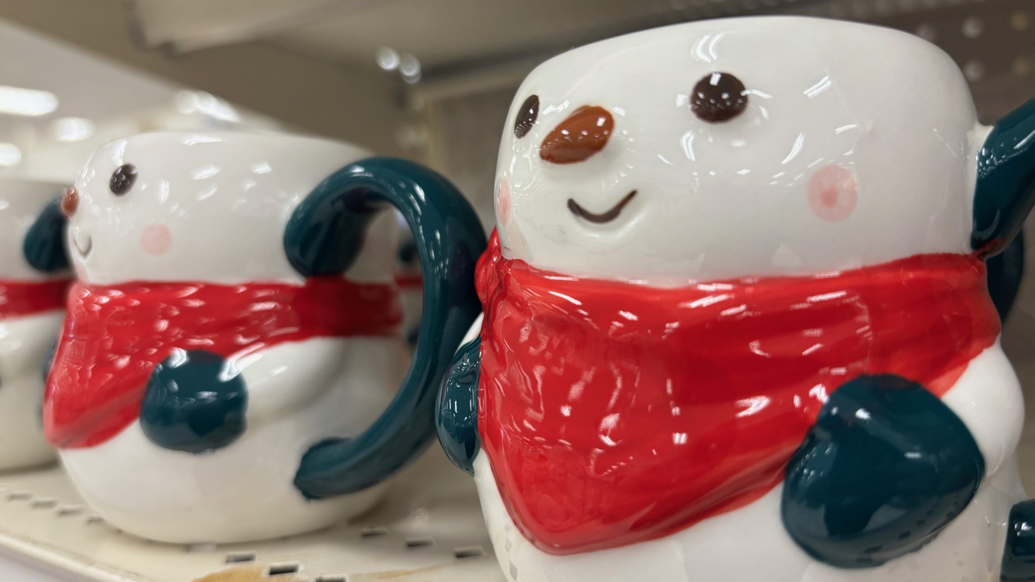 Alternative Text: Closeup of two mugs shaped like snowmen with smiling faces and red kerchiefs around their necks.