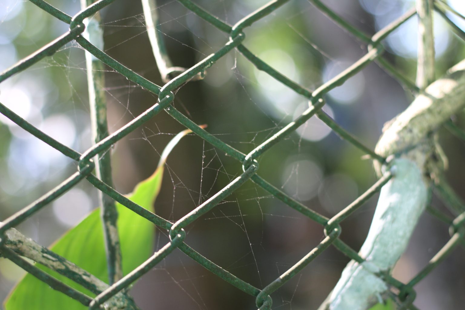 Alternative Text: A close-up view of a green metal fence with sections of spider silk visible among the intersecting wires