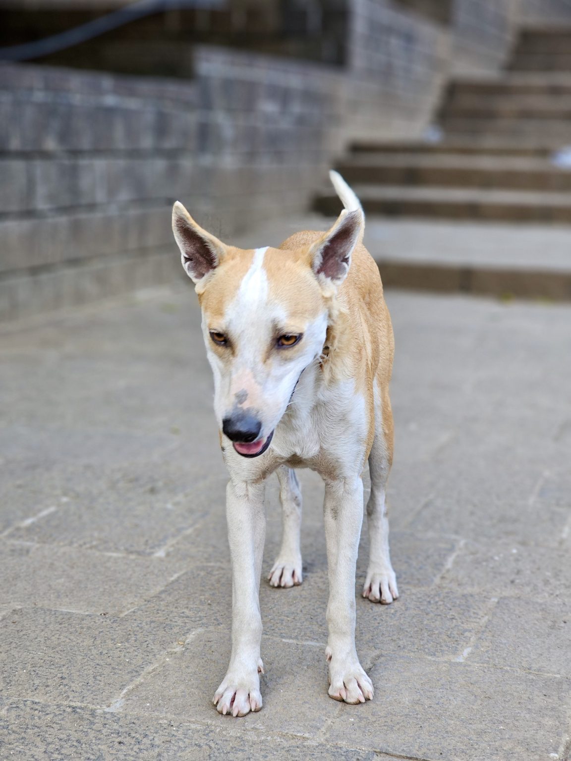 Alternative Text: A street dog standing on the pathway near the Elephanta Caves, Mumbai. It looks relaxed and curious in the quiet surroundings.