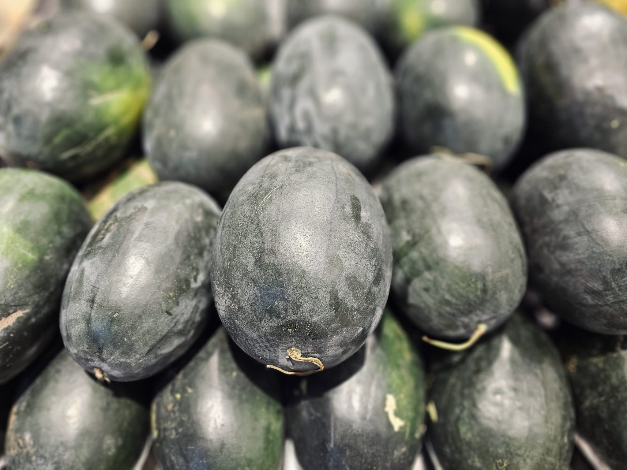 Alternative Text: Dark green watermelons are arranged closely in a hypermarket in Kozhikode, Kerala.