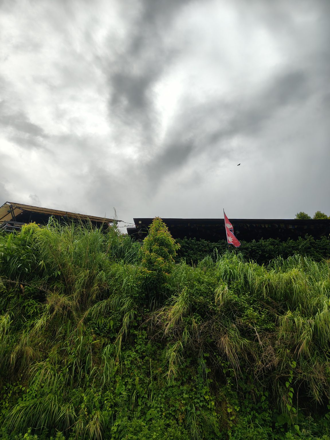 Alternative Text: The flag of Nepal fluttering on the nature with green bushes and plants on the ground and above is the dark cloudy sky. A bird flying on the sky is visible.