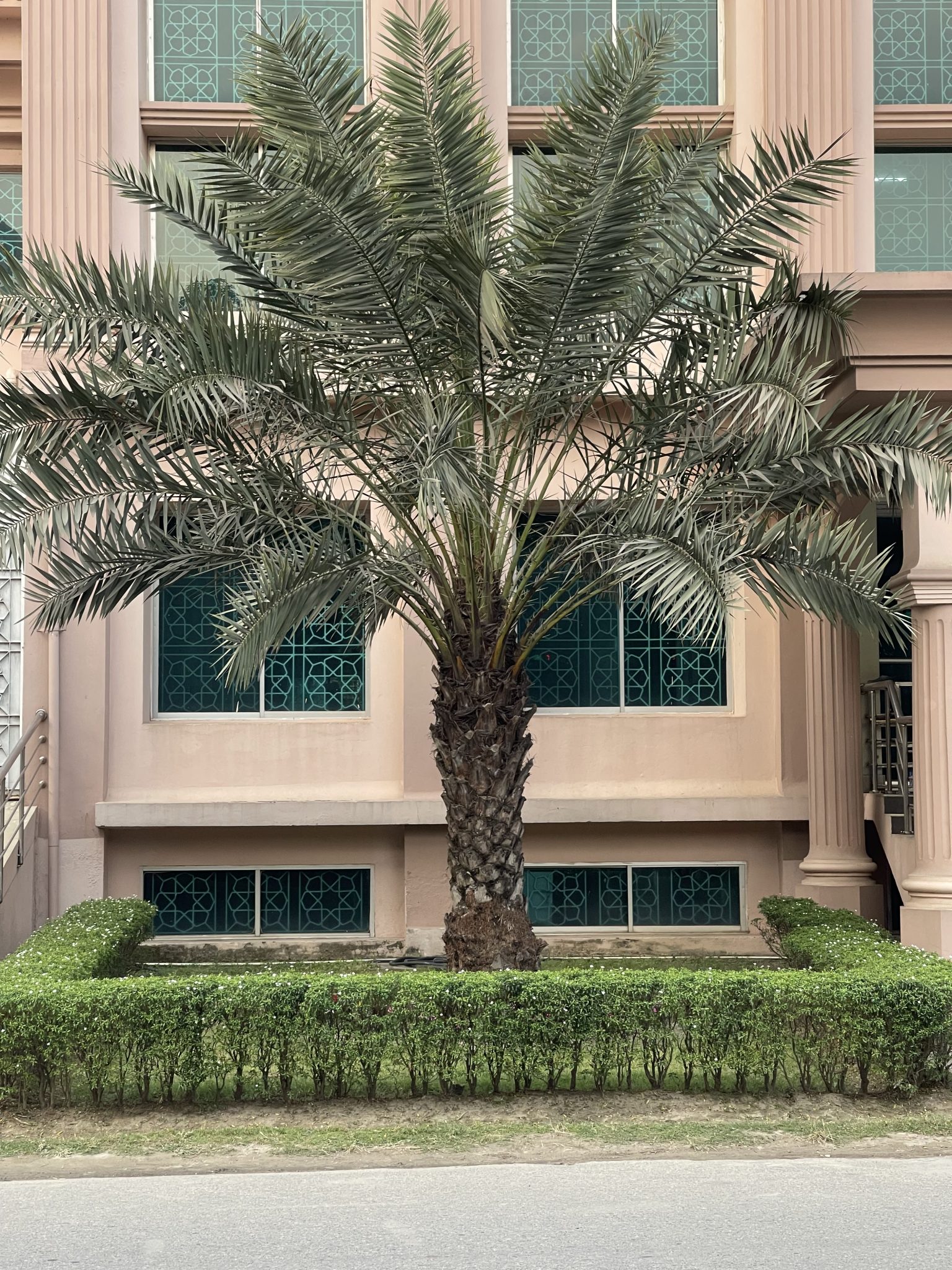 Alternative Text: A tall palm tree stands before a light-colored building with large turquoise-patterned windows, surrounded by neat hedges and well-kept landscaping.