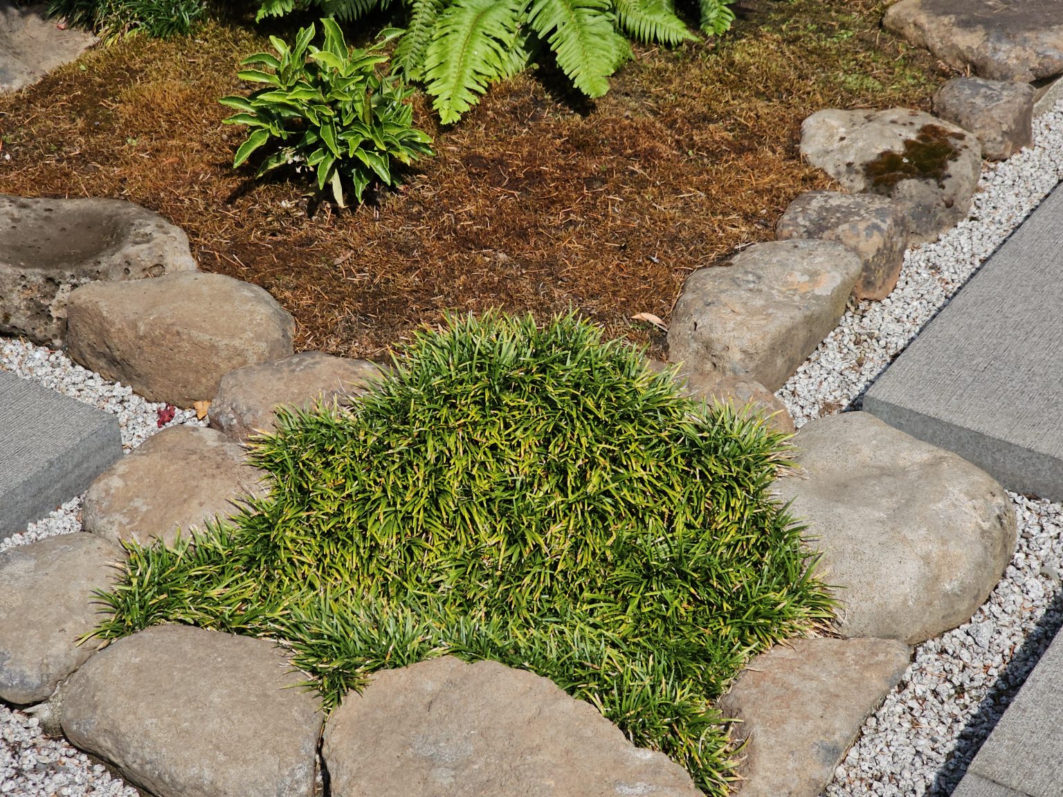 Alternative Text: A small garden with moss, green plants, and stones placed in a circle, taken in the Portland Japanese Garden.