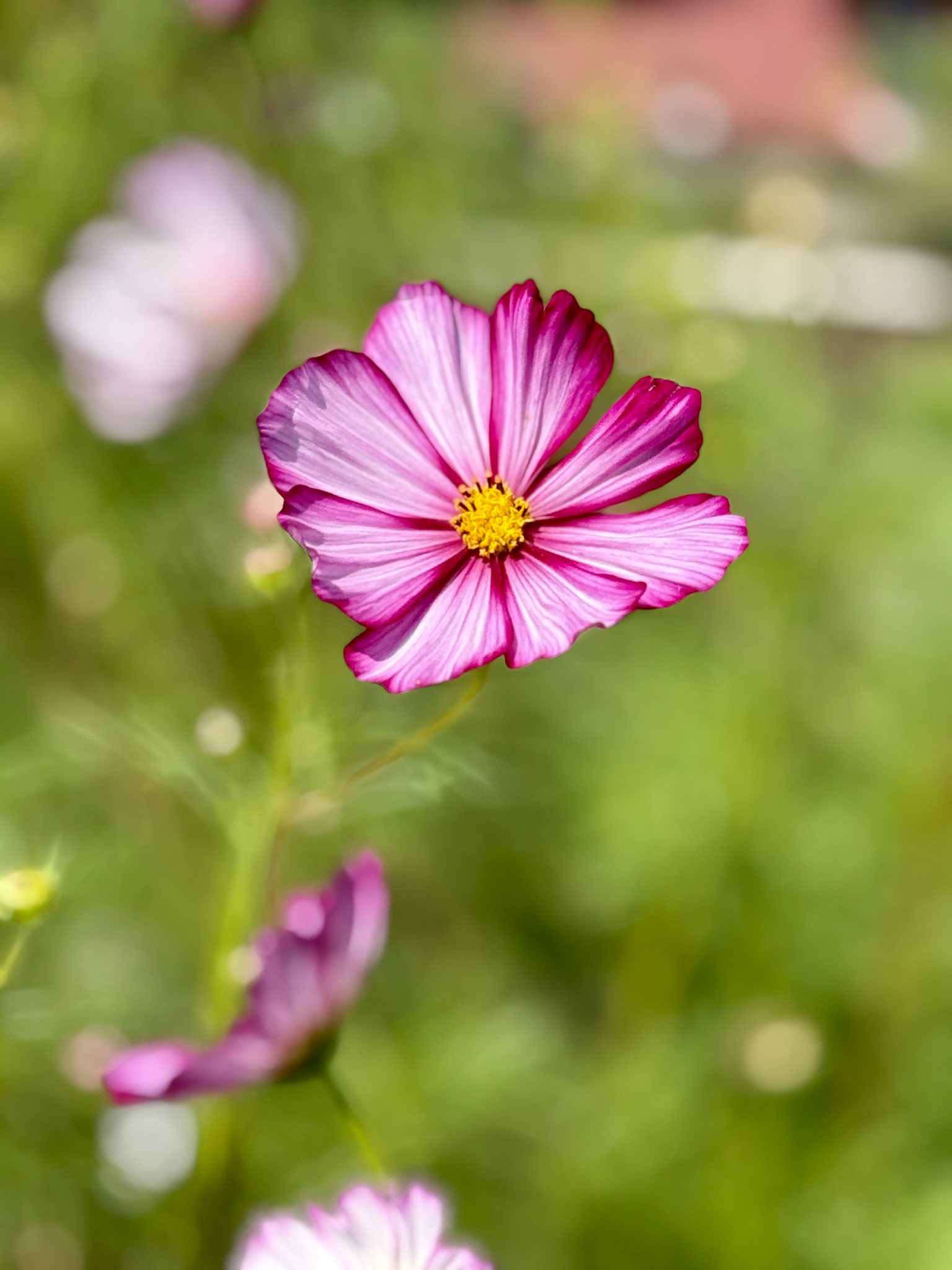Alternative Text: A single pink cosmos flower with white streaks stands out clearly. The background is soft and blurred, showing more flowers and greenery. Captured at the Oregon Zoo, Portland