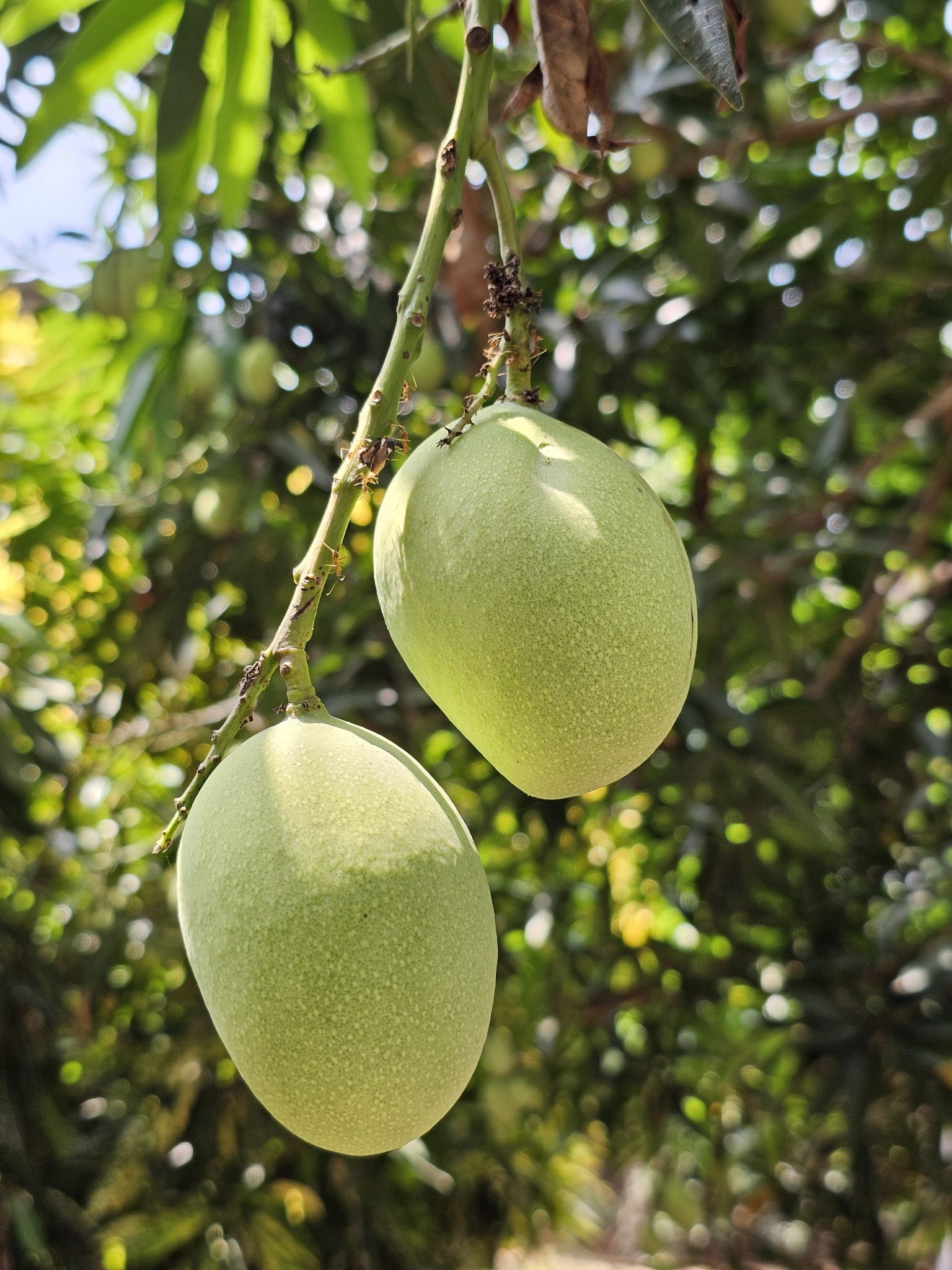 Alternative Text: Two green mangoes hanging from a tree branch, surrounded by lush green leaves in the background.