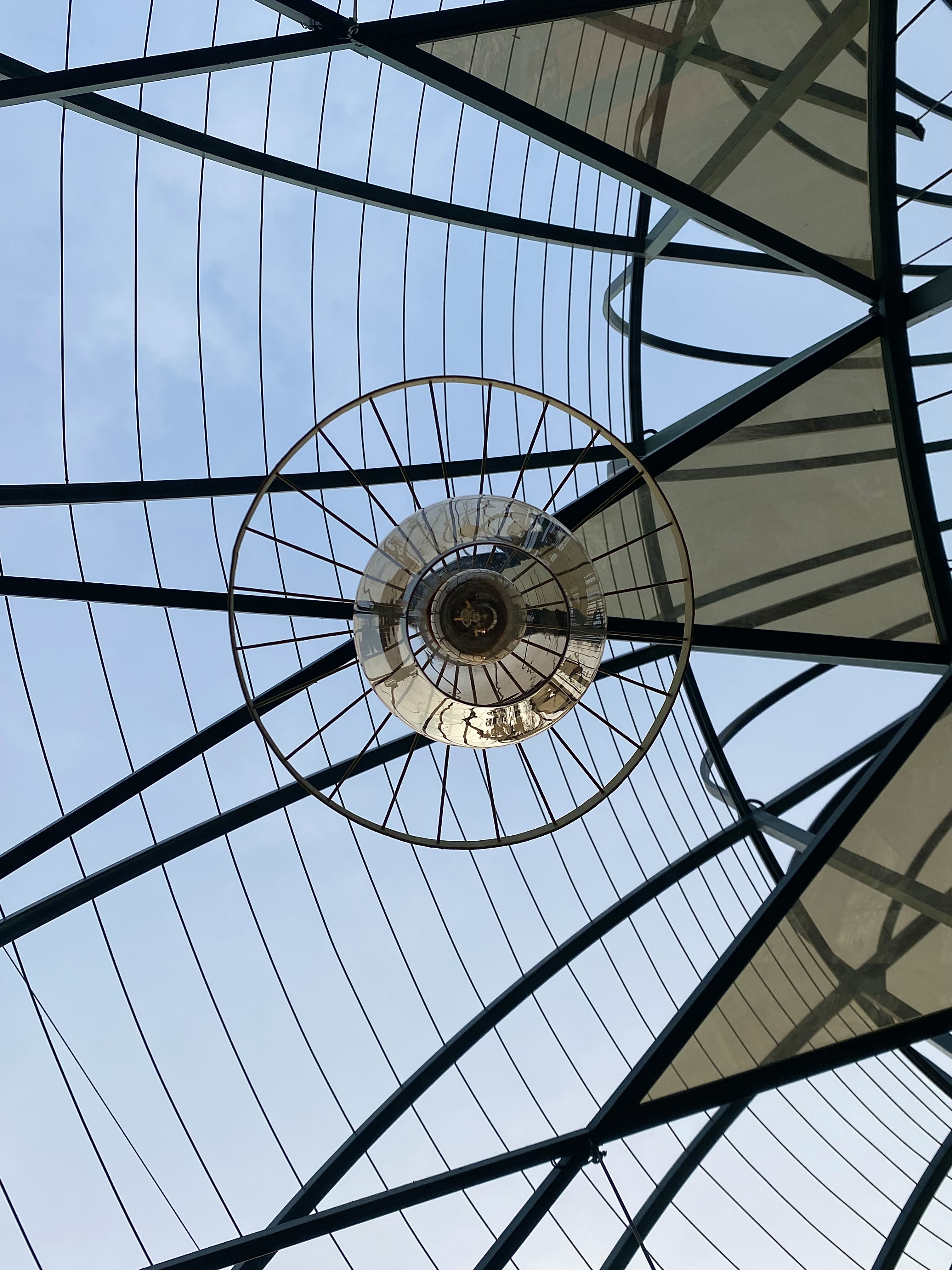 Alternative Text: Looking up at a geometric glass ceiling with a circular chandelier and sky beyond.