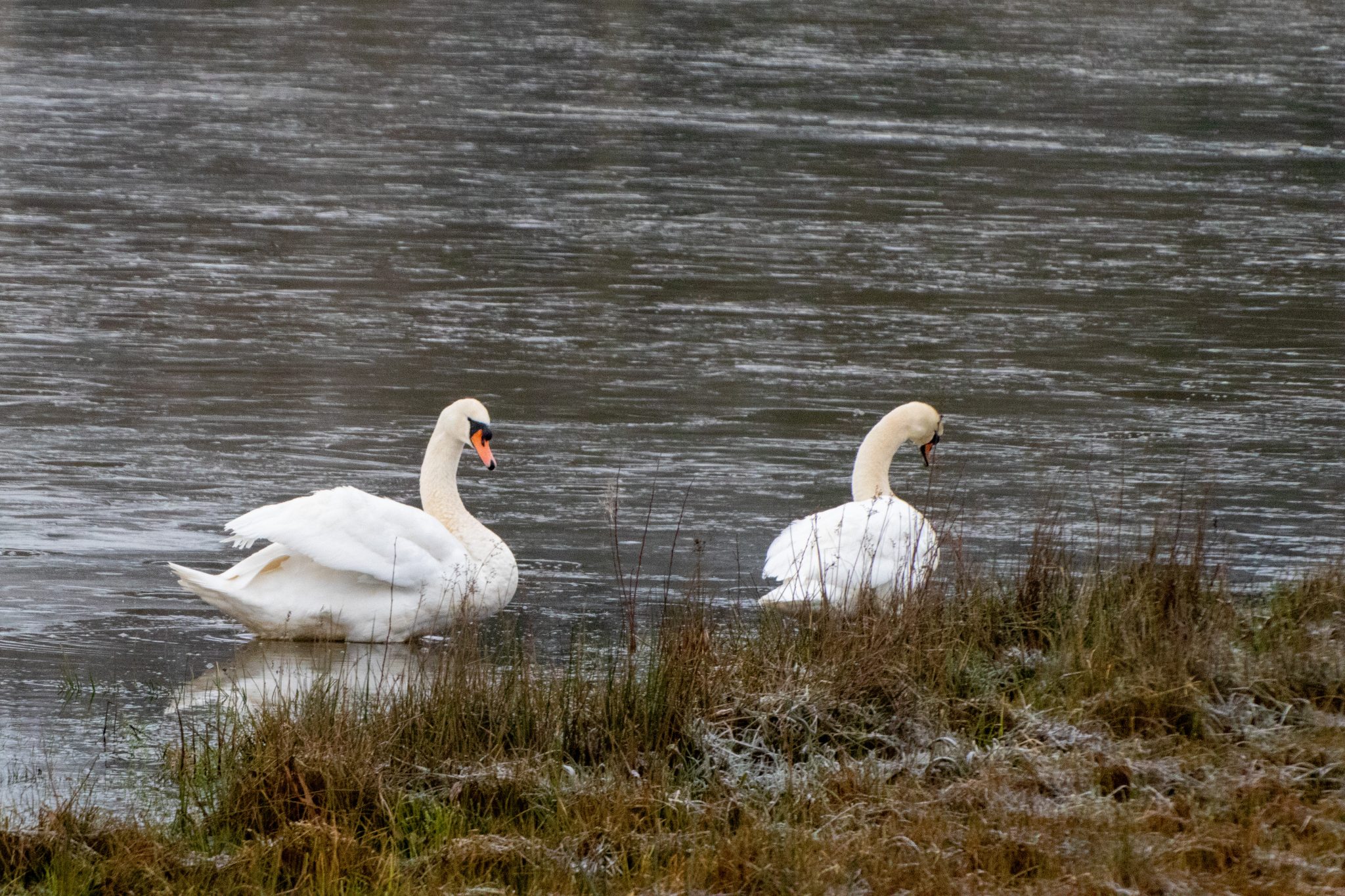 Alternative Text: Two swans standing by the water’s edge with a backdrop of rippling water and grassy shore.