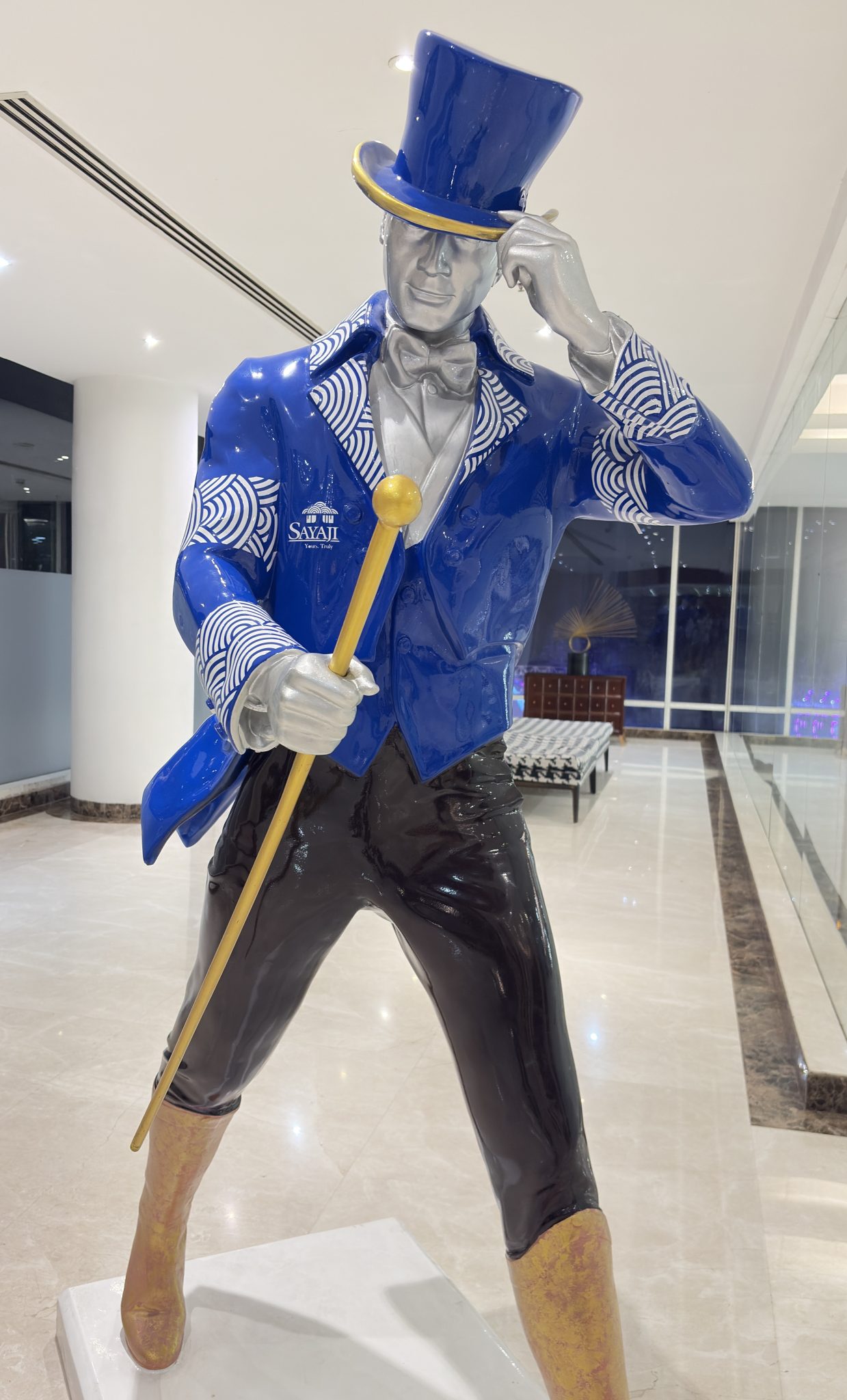 Alternative Text: Colorful statue of a stylized man wearing a blue top hat, matching blue coat with white patterns, a silver bow tie, black pants, and yellow boots. He is holding a yellow cane and posing as if tipping his hat, placed in a well-lit indoor space with marble flooring.