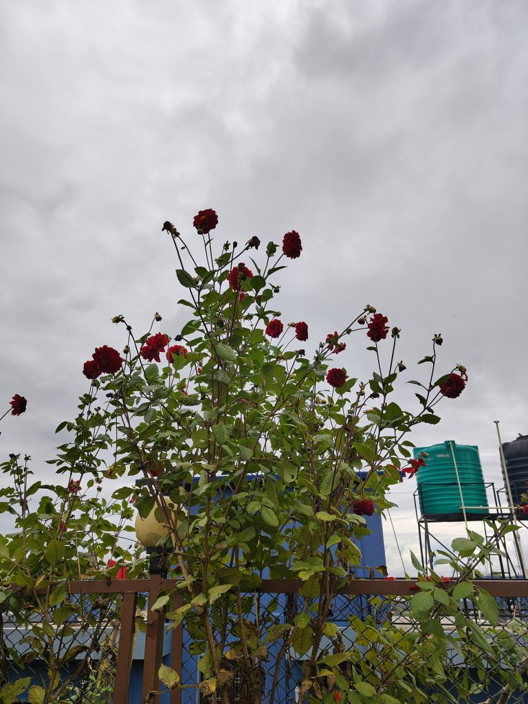 Alternative Text: A vibrant display of red roses is seen growing against a cloudy sky.