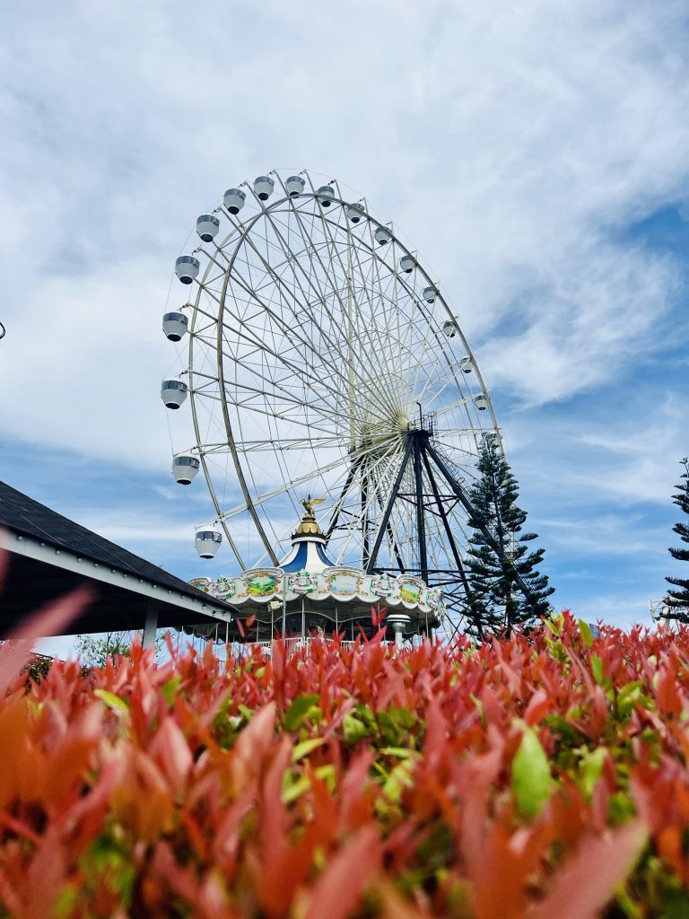 Alternative Text: Ferris wheel against a blue sky, framed by red flowers and a carousel below. The scene conveys a cheerful, playful atmosphere with a sense of leisure.