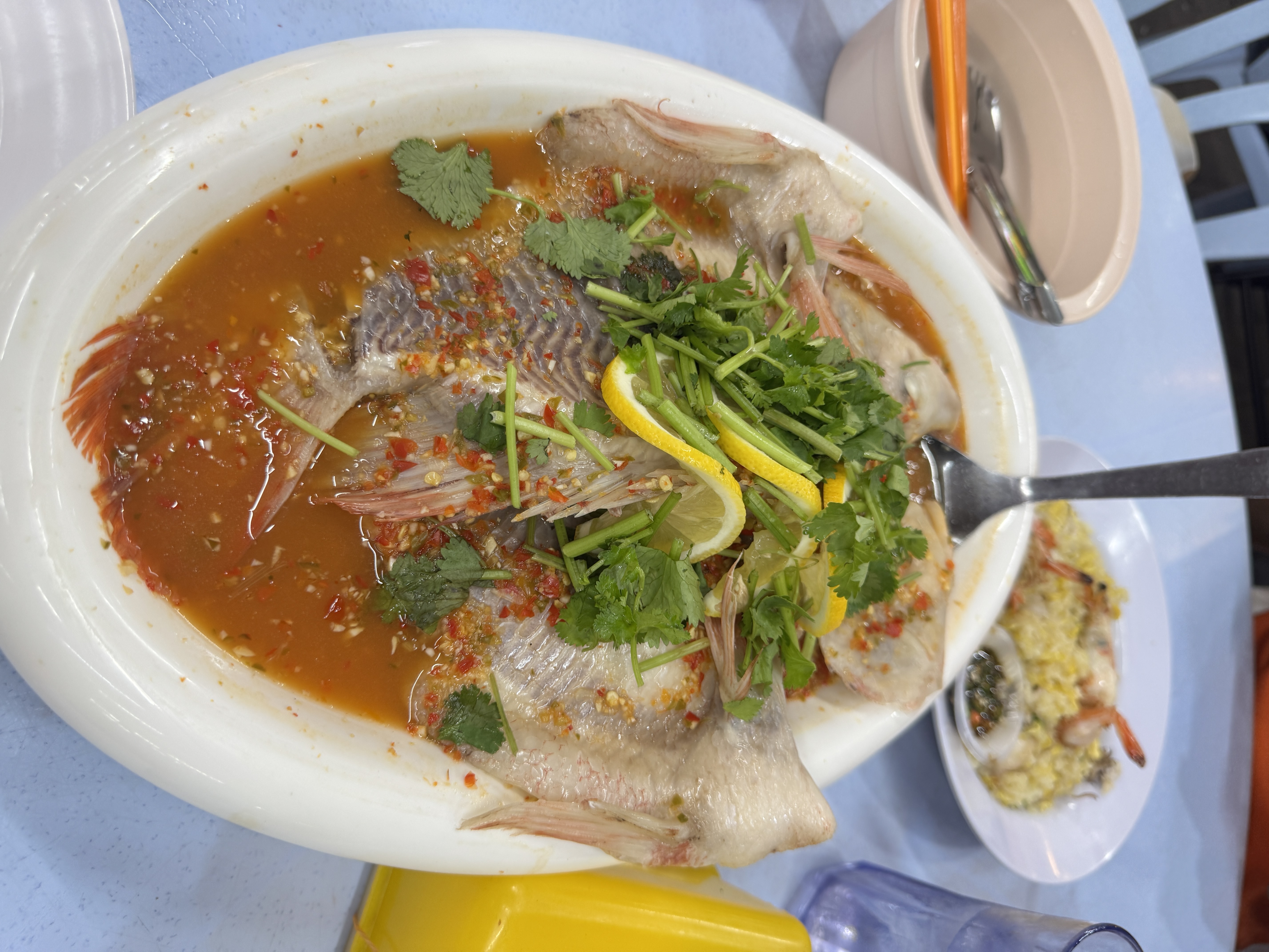 Alternative Text: A white oval platter filled with a whole steamed fish, garnished with fresh cilantro, thin slices of lemon, and chopped green onion. The fish is surrounded by a rich, spicy sauce containing red chili flakes and herbs. In the background, a small plate with a serving of fried rice and seafood can be seen, along with a bowl of soup and a pair of chopsticks. The setting features a blue table surface.