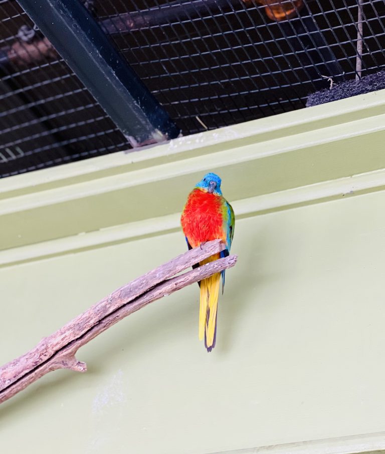 Alternative Text: A brightly colored bird with a red chest, blue head, and yellow tail perched on a branch.